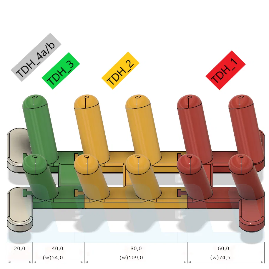Với mẫu này, tui muốn đáp ứng 2 yêu cầu: Cái giá đỡ này phải đựng được càng nhiều nắp nồi càng tốt và tận dụng tối đa không gian có sẵn trong ngăn kéo. Mấy ông ơi, tui có thể nói là trong tất cả các món 3D tui in ra tới giờ, cái này có tỉ lệ WAF cao nhất đó nha. Mấy ông biết tui muốn nói gì mà. :-) Chỉ cần in một loạt các bộ phận khác nhau, khi ghép lại sẽ gần bằng với kích thước ngăn kéo nhà mình. Hoặc tương ứng với số nắp nồi mình muốn đựng. Cập nhật 2024-12-10: Đã tăng dung sai của các khớp nối TDH_3 / TDH_3_w. Cập nhật 2023-01-27: Theo yêu cầu, tui đã tạo phiên bản thứ hai có chỗ cho các nắp dày hơn. Mấy ông cũng có thể dùng chung các bộ phận của cả hai phiên bản. Như vậy, mấy ông có thể tùy biến cách kết hợp các bộ phận đó còn linh hoạt hơn nữa. Khe nhỏ hơn có thể chứa các nắp có độ dày ở cạnh tới khoảng 19mm, khe lớn hơn chứa tới khoảng 33mm. Hình sau đây cho thấy mỗi loại trong 4 bộ phận khác nhau với chiều dài của chúng. Các kích thước của phiên bản rộng hơn được đánh dấu bằng (w). Trong hình sau, mấy ông có thể thấy cách tui sắp xếp nè: 1 x TDH_1, TDH_3 và TDH_4ab mỗi loại và 3 x TDH_2. Như vậy tui có một cái giá đỡ mà tui có thể đựng 8 cái nắp nồi trên chiều dài chỉ 36cm. #### Thông tin in Chiều cao lớp: 0.20mm Chu vi: 3 Ruột: 25% Support: không có Nếu mấy ông xài đầu phun 0.6mm, có thể tăng chiều cao lớp lên 0.4mm. Như vậy sẽ in xong nhanh hơn nhiều. ### Tui rất mong chờ thành quả của mấy ông! :-) Nếu thích mẫu này, cứ xem các mẫu khác của tui tại đây. Sợi nhựa filament được dùng trong các hình trên là: Extrudr PLA NX2 Black