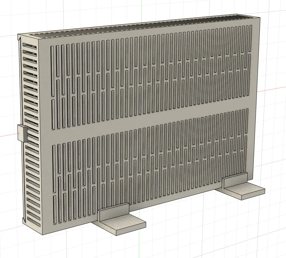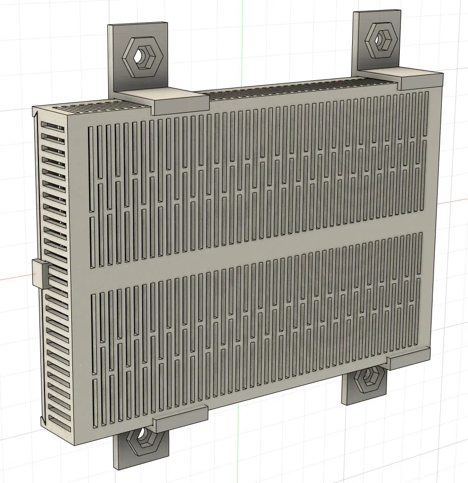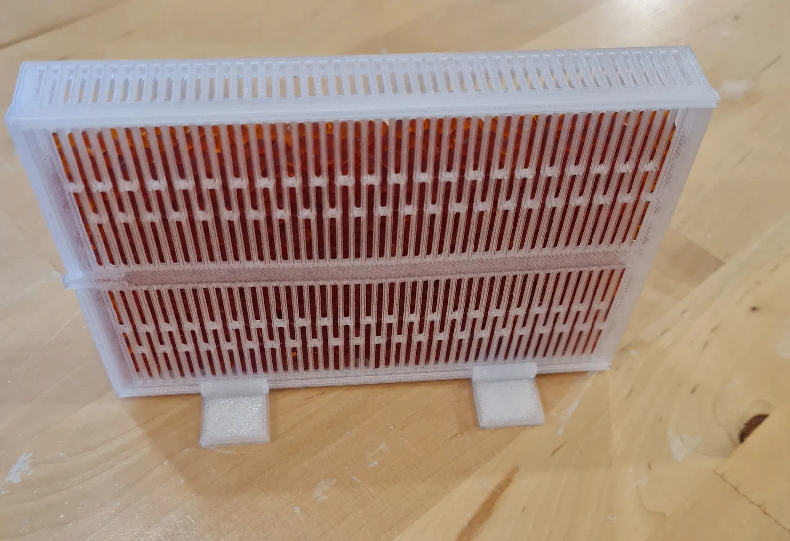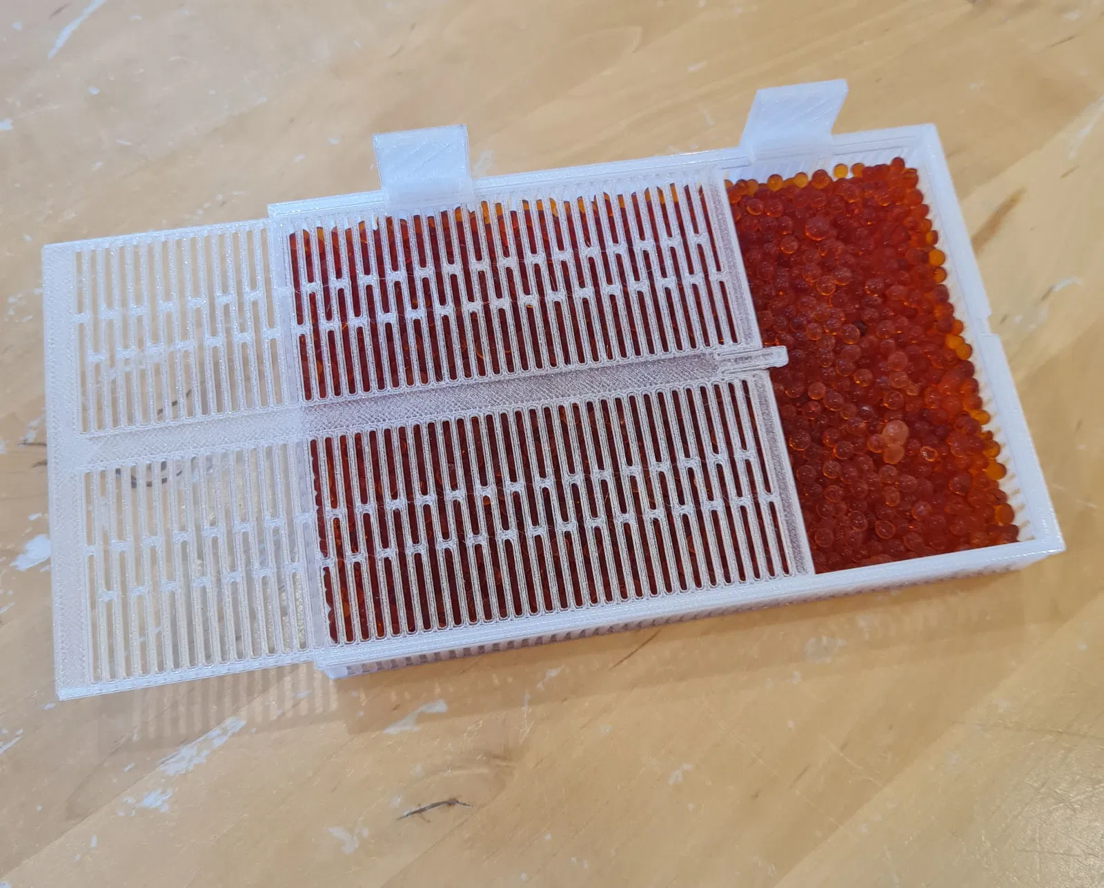 Hộp đựng chất hút ẩm đơn giản. Nắp trượt vào các rãnh và được giữ lại bằng một cái kẹp. Nó có chân kẹp hoặc giá đỡ để trượt vào. Giá đỡ có vật liệu hỗ trợ được tạo sẵn sẽ cần phải bẻ ra.