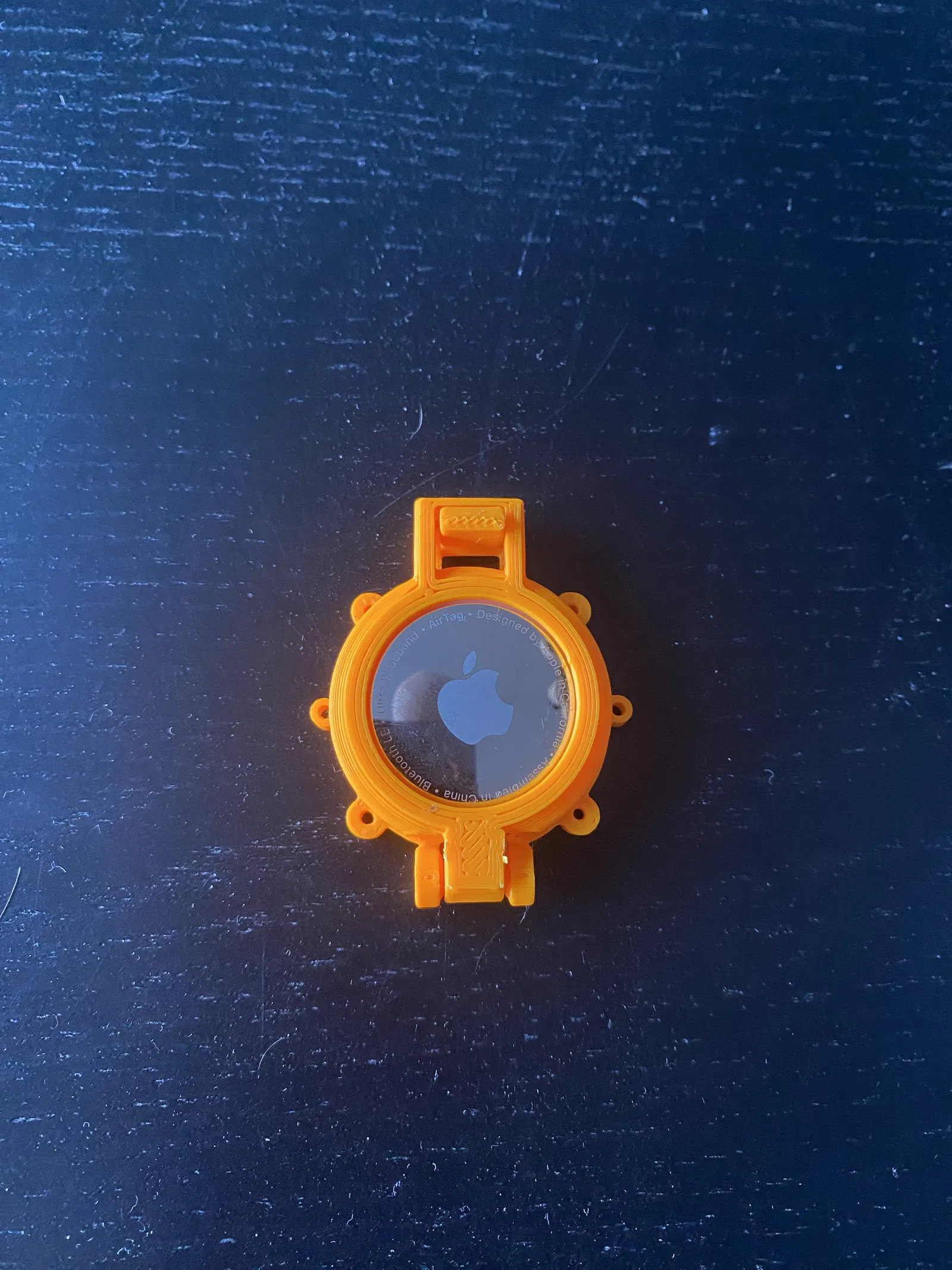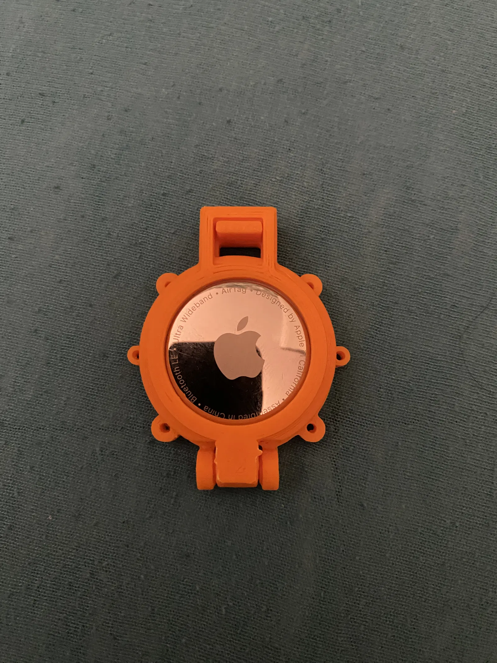 Ốp lưng và đế giữ Airtag (in-place)(không support). Thiết kế có lỗ để may vào quần áo hoặc treo như mặt dây chuyền. In bằng sợi ASA trên máy Creality k1.
