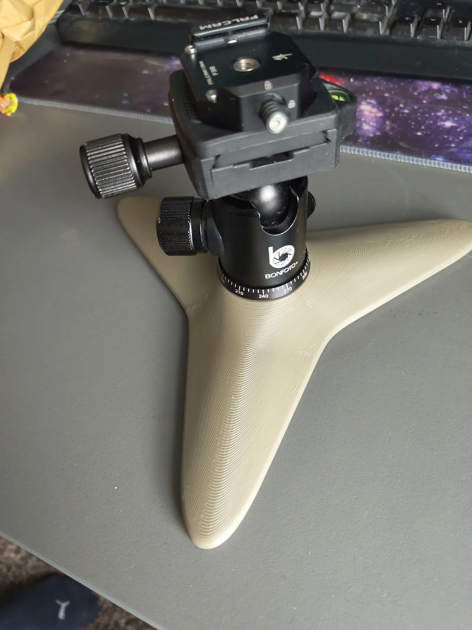 Giá đỡ Camera 3 chân phổ biến, được thiết kế đơn giản để gắn Camera lên tripod. In bằng ABS với độ dày lớp 0.15mm và mật độ điền 25% cho độ ổn định cao, phù hợp cho các loại Camera nặng.