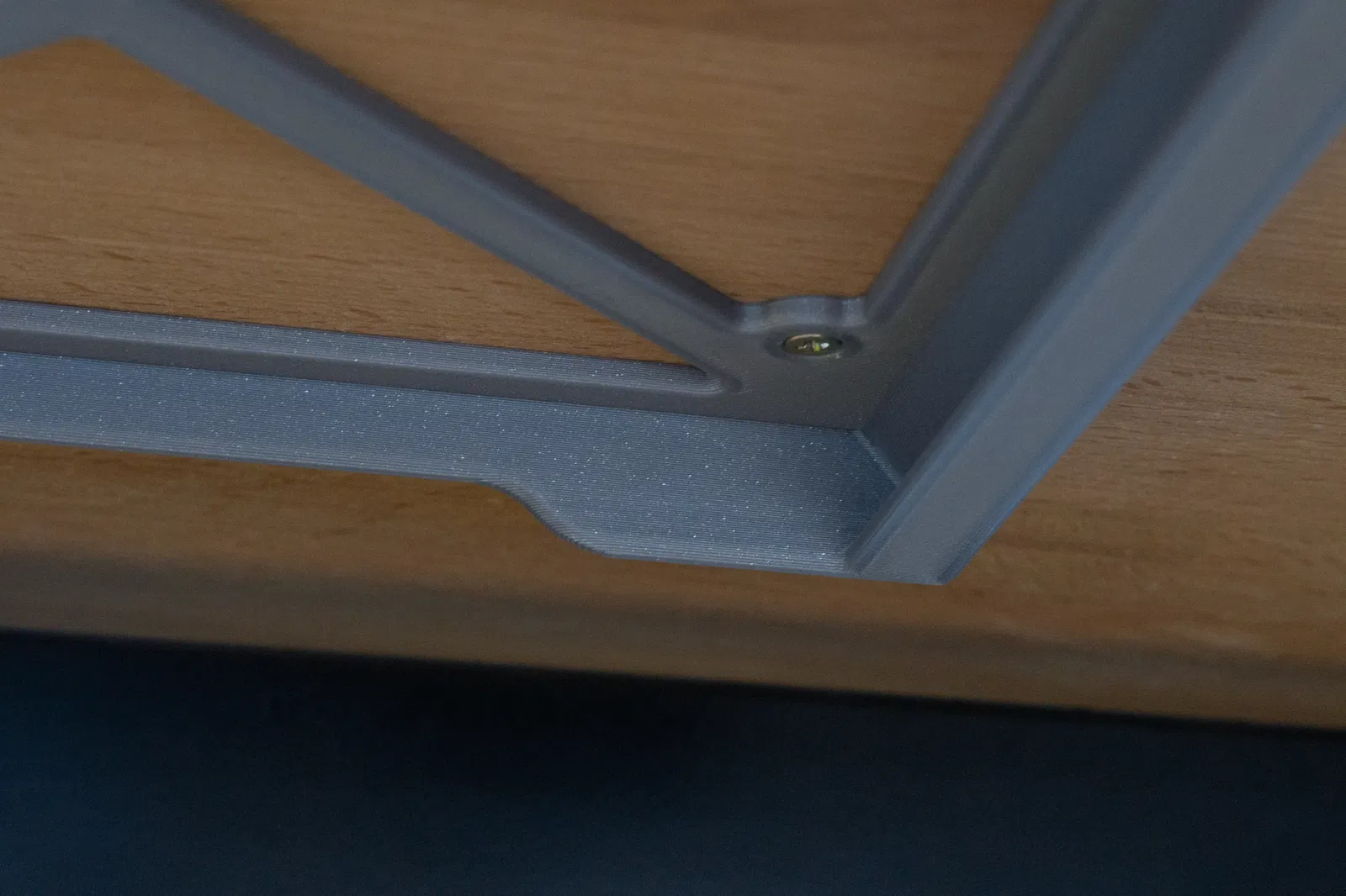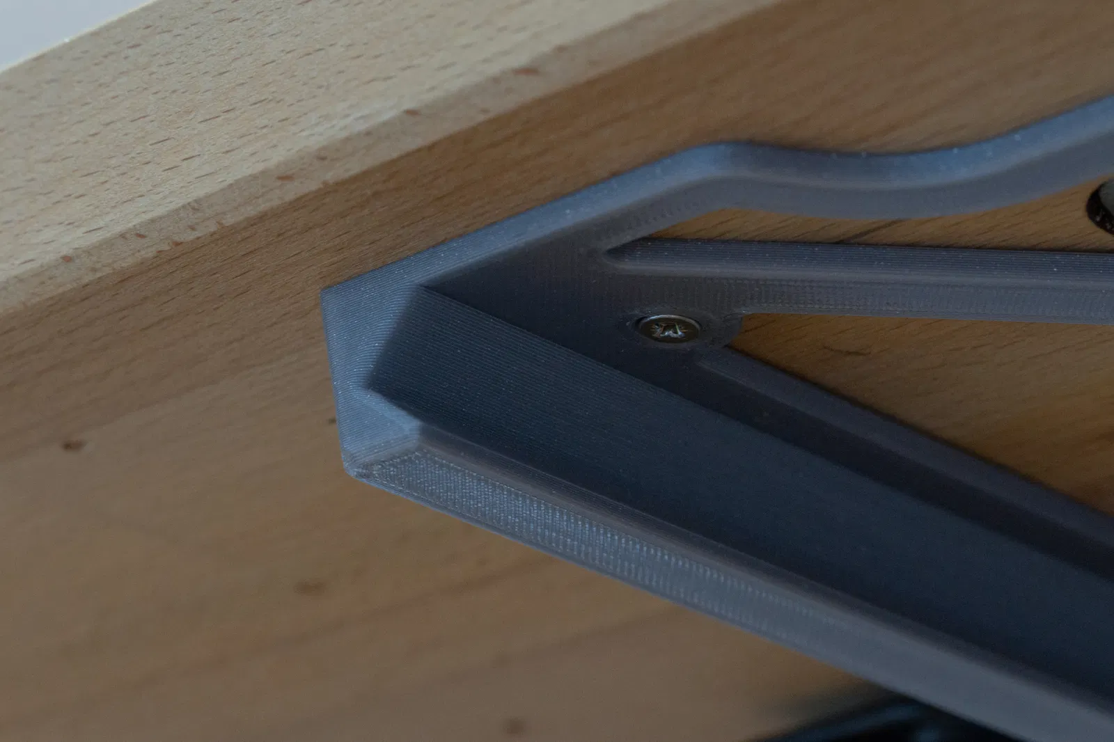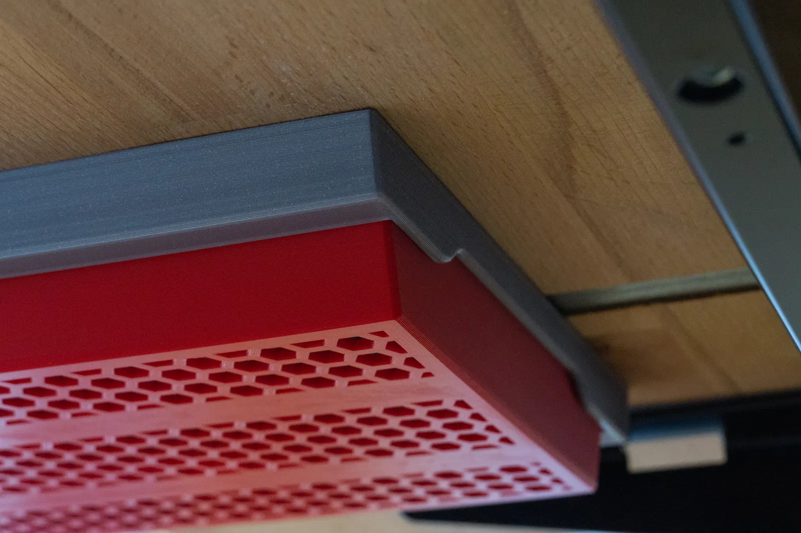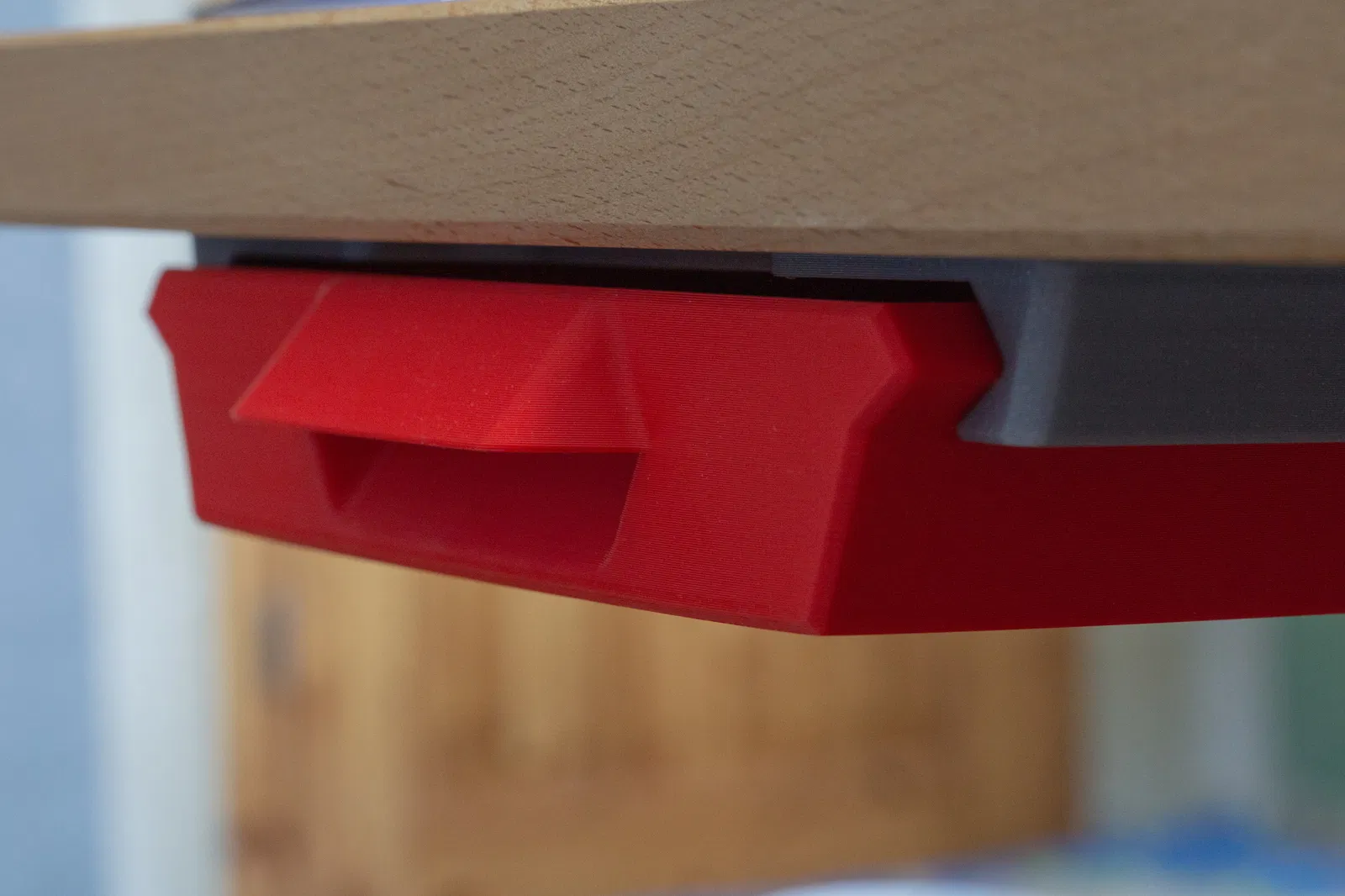 Để gắn cái ngăn kéo dưới bàn, bạn chỉ cần 4 con vít gỗ ⌀3mm. Ưu điểm là bạn không cần chỉnh khoảng cách các thanh ray (như mấy thiết kế khác) vì chúng đã được chỉnh chuẩn rồi.