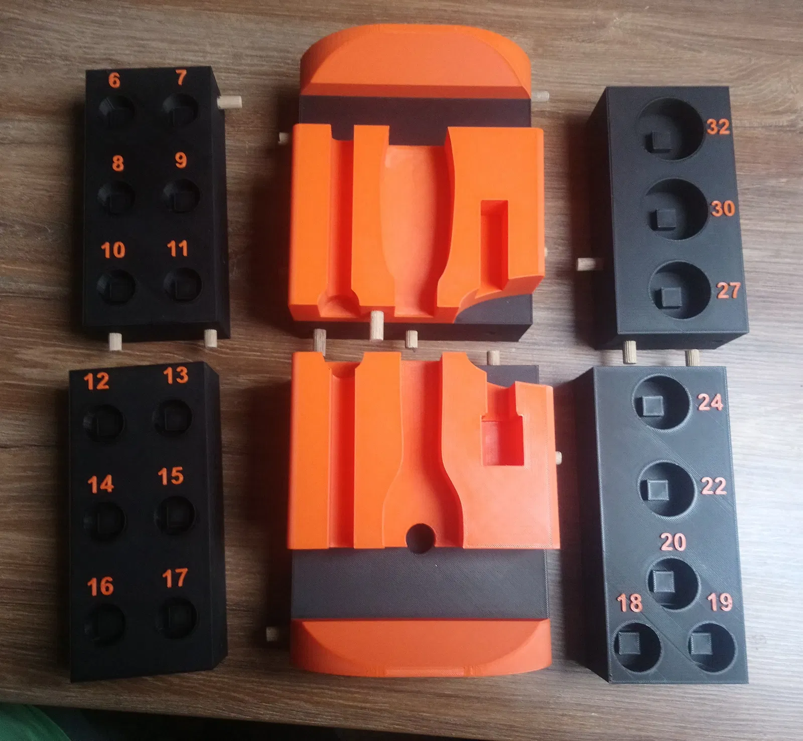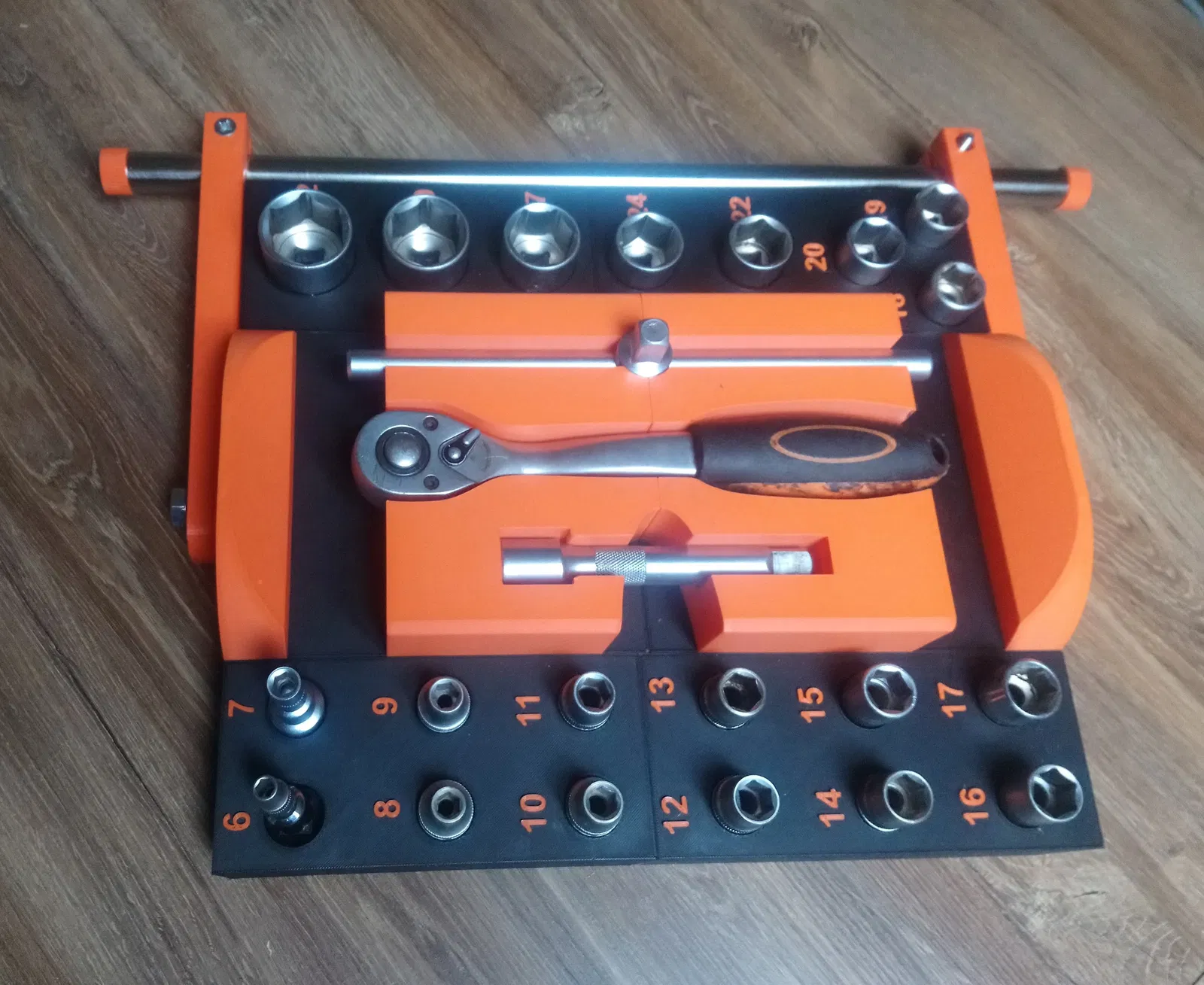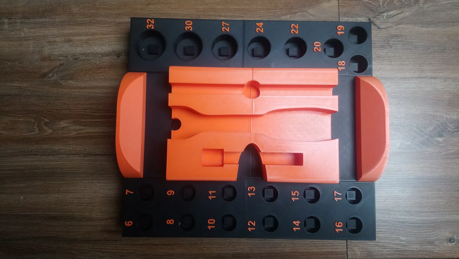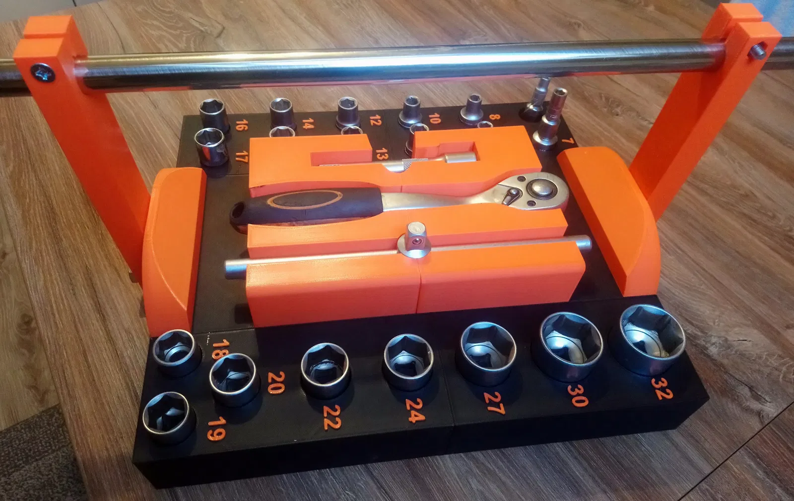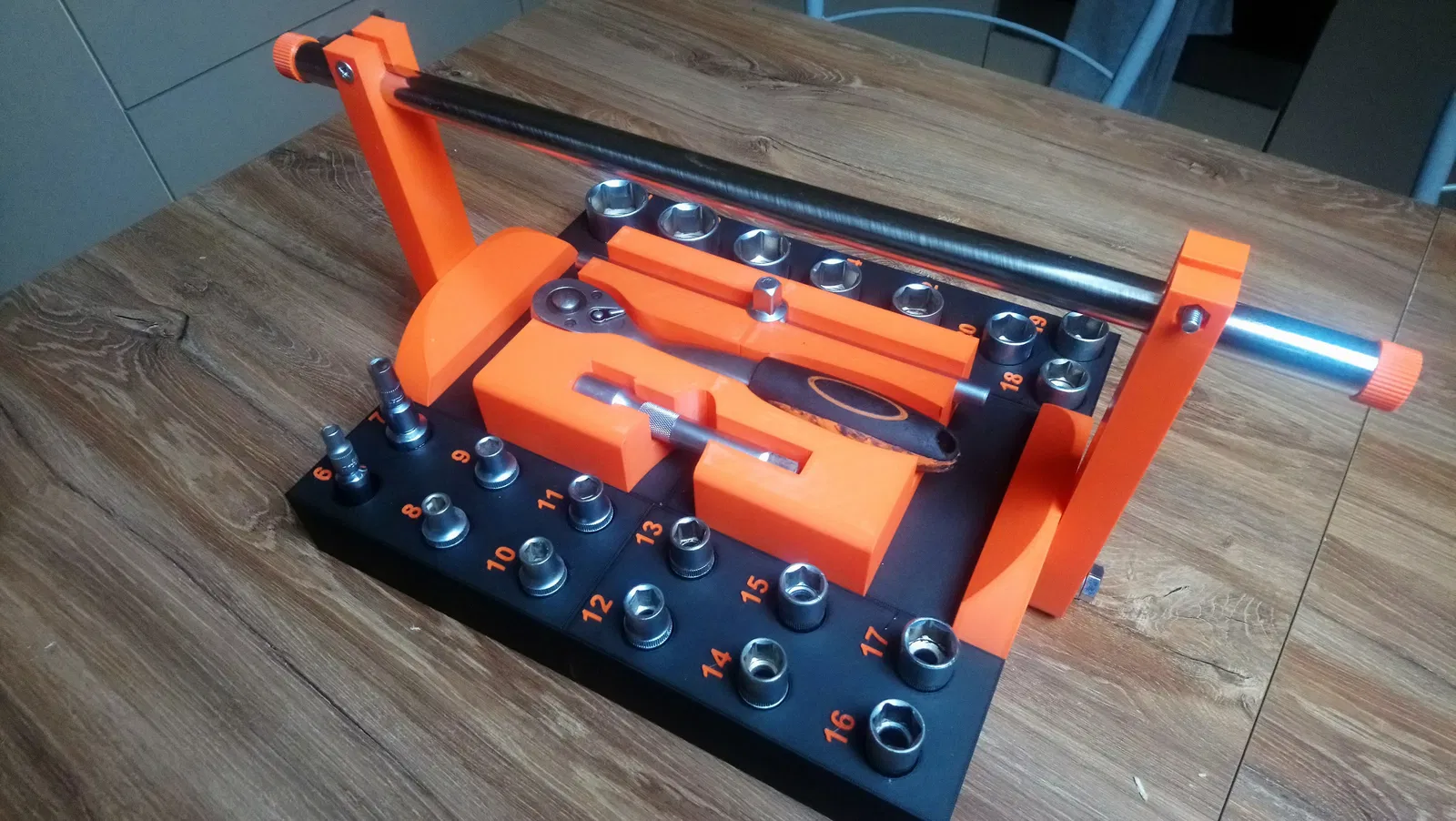 Hộp đựng/khay cho bộ tuýp 1/2 inch từ số 6 đến 32, có tay cầm xoay 90 độ. Chia làm 6 phần dễ in, chỉ cần vài ốc và chốt gỗ để lắp ráp. In bằng PLA, không cần support.