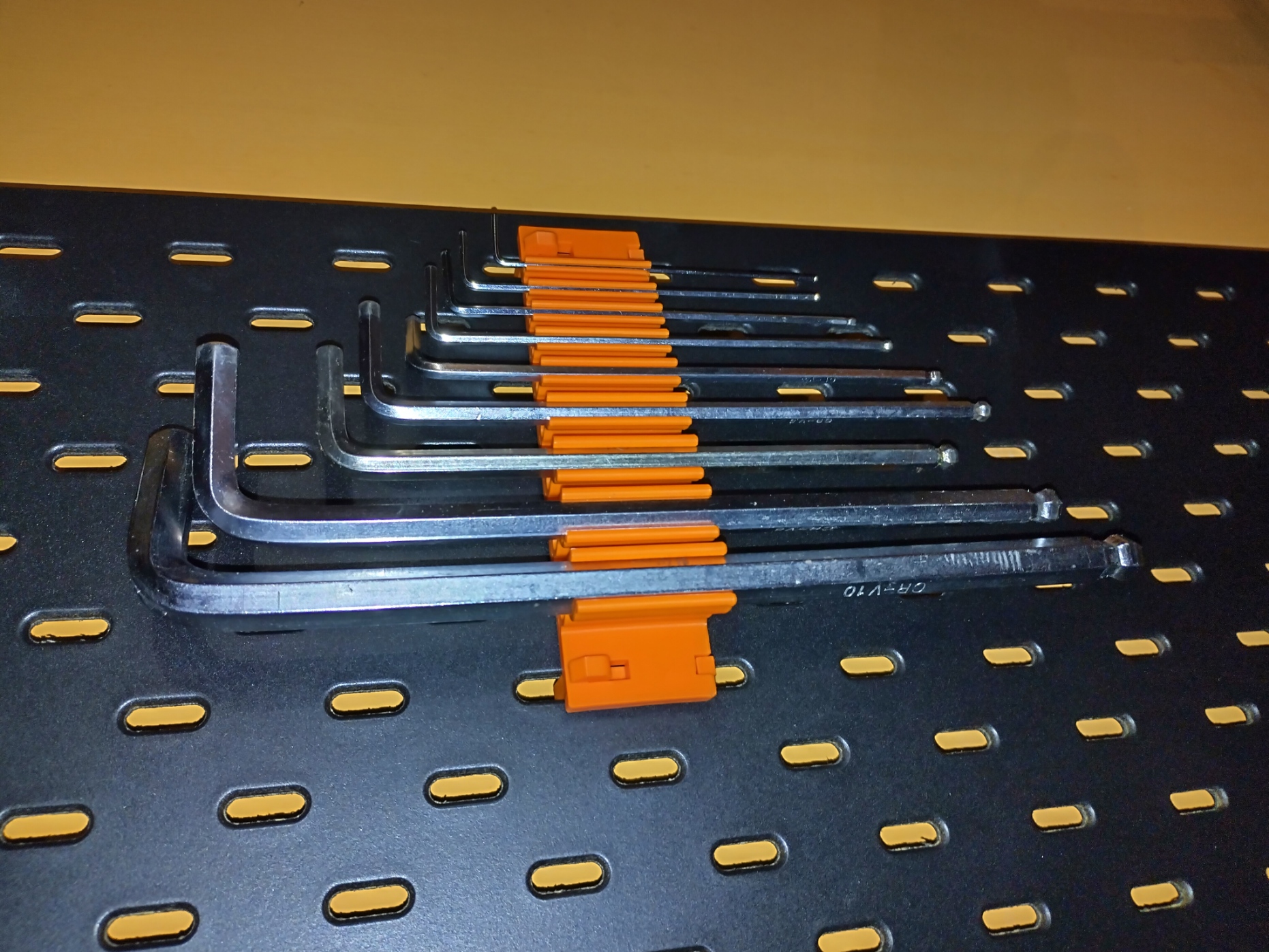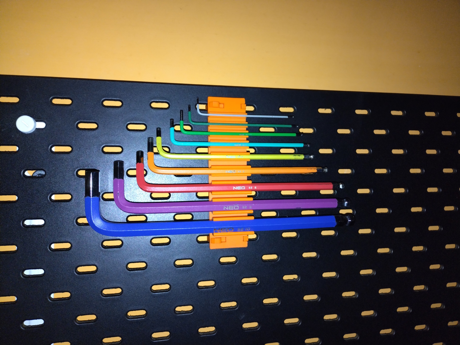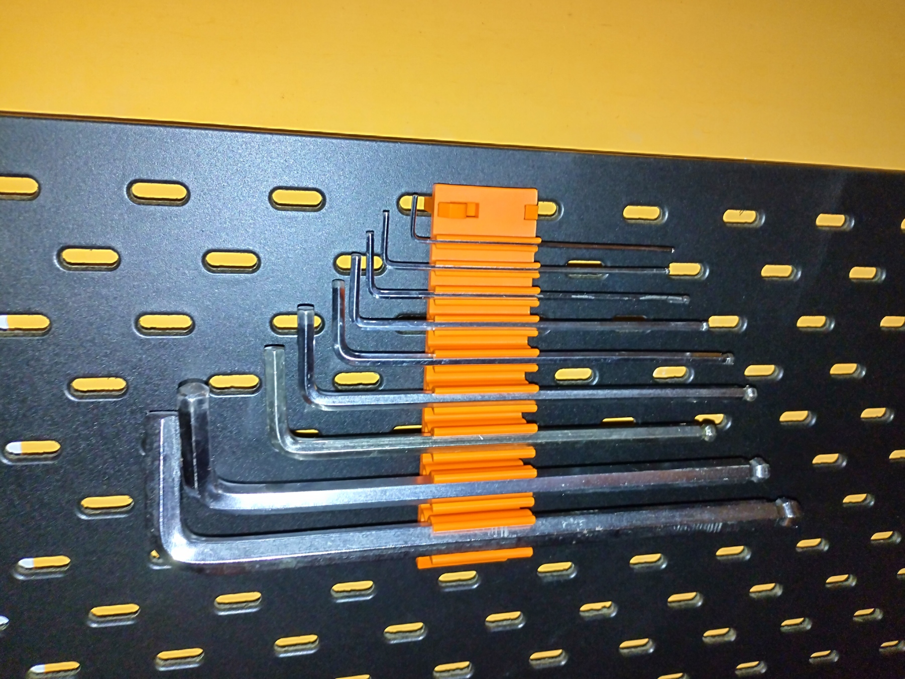 Đây là một mẫu thiết kế đơn giản để đựng lục giác. Nó vừa với các chìa khóa lục giác có kích thước 1.5, 2.0, 2.5, 3, 4, 5, 6, 8 và 10 mm. Tôi đã sử dụng móc treo đa năng skadis để gắn nó lên bảng treo /3d-model/moc-da-nang-skadis