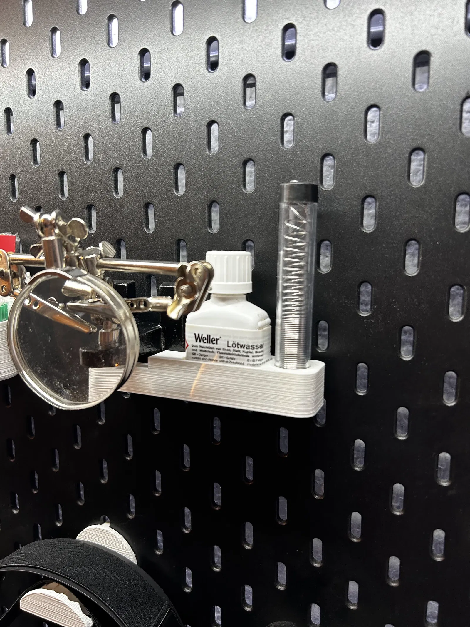Cái organizer tui tự làm để giữ bộ dụng cụ hàn, chai flux/löftwasser và ống thiếc hàn của tui trên bảng pegboard IKEA Skådis.