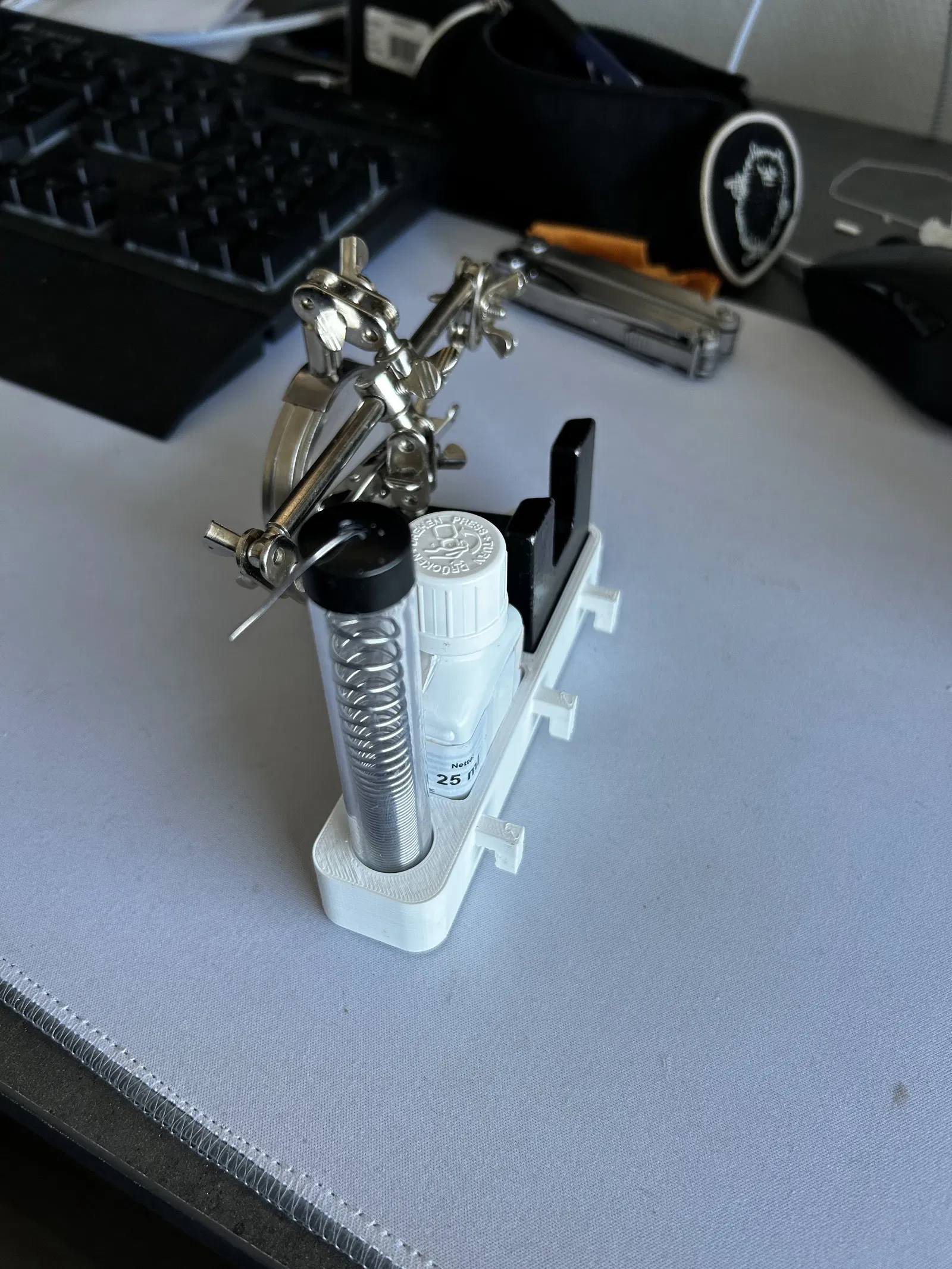 Organizer tui tự làm để giữ bộ dụng cụ hàn, chai flux/löftwasser và ống thiếc hàn trên bảng pegboard IKEA Skådis. Rất tiện lợi cho anh em nào hay làm việc với đồ điện tử.