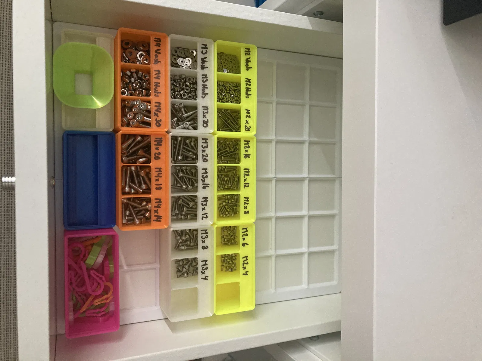 Phòng in của tui thì gần như toàn bộ là đồ nội thất của IKEA Kallax hết nên tui có chỉnh lại cái "Gridfinity grid" xịn xò của Zach Friedman chút để nó vừa với mấy cái khay của ngăn kéo Kallax.