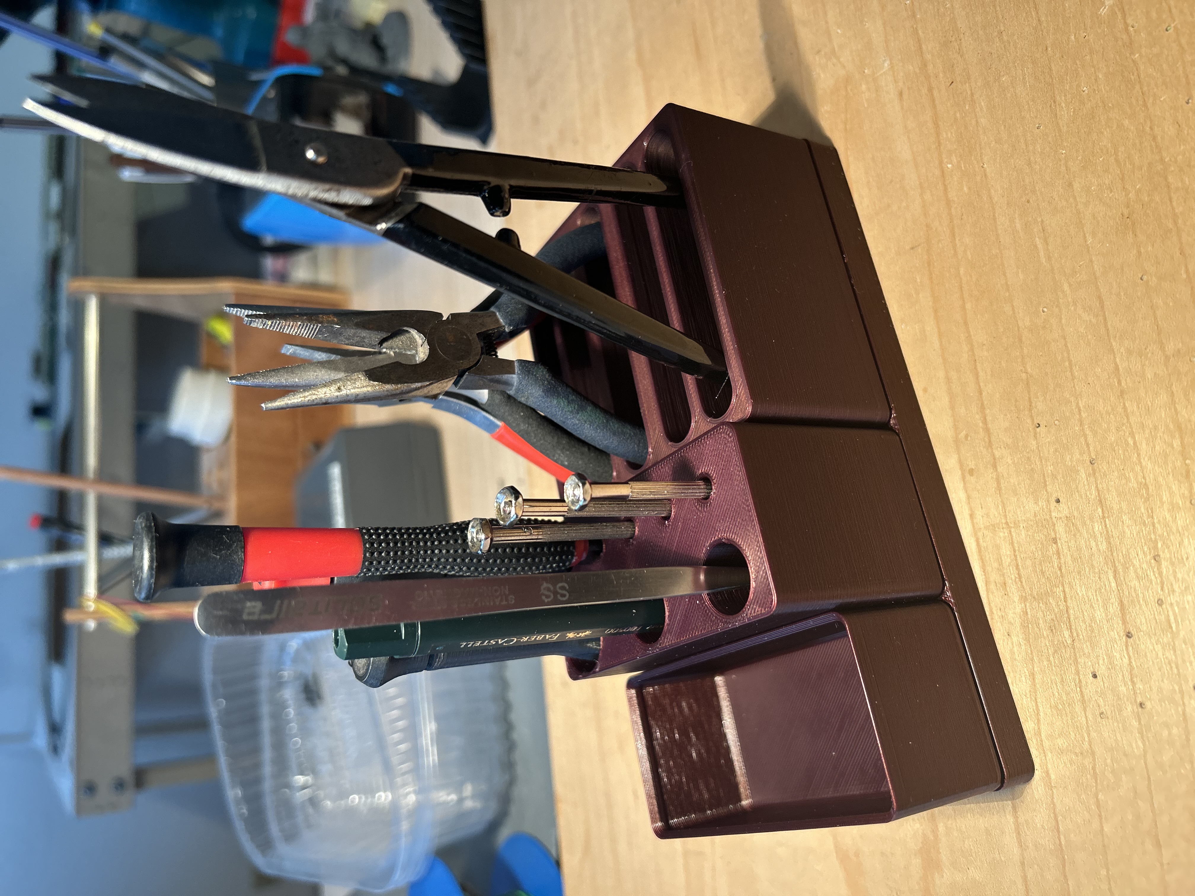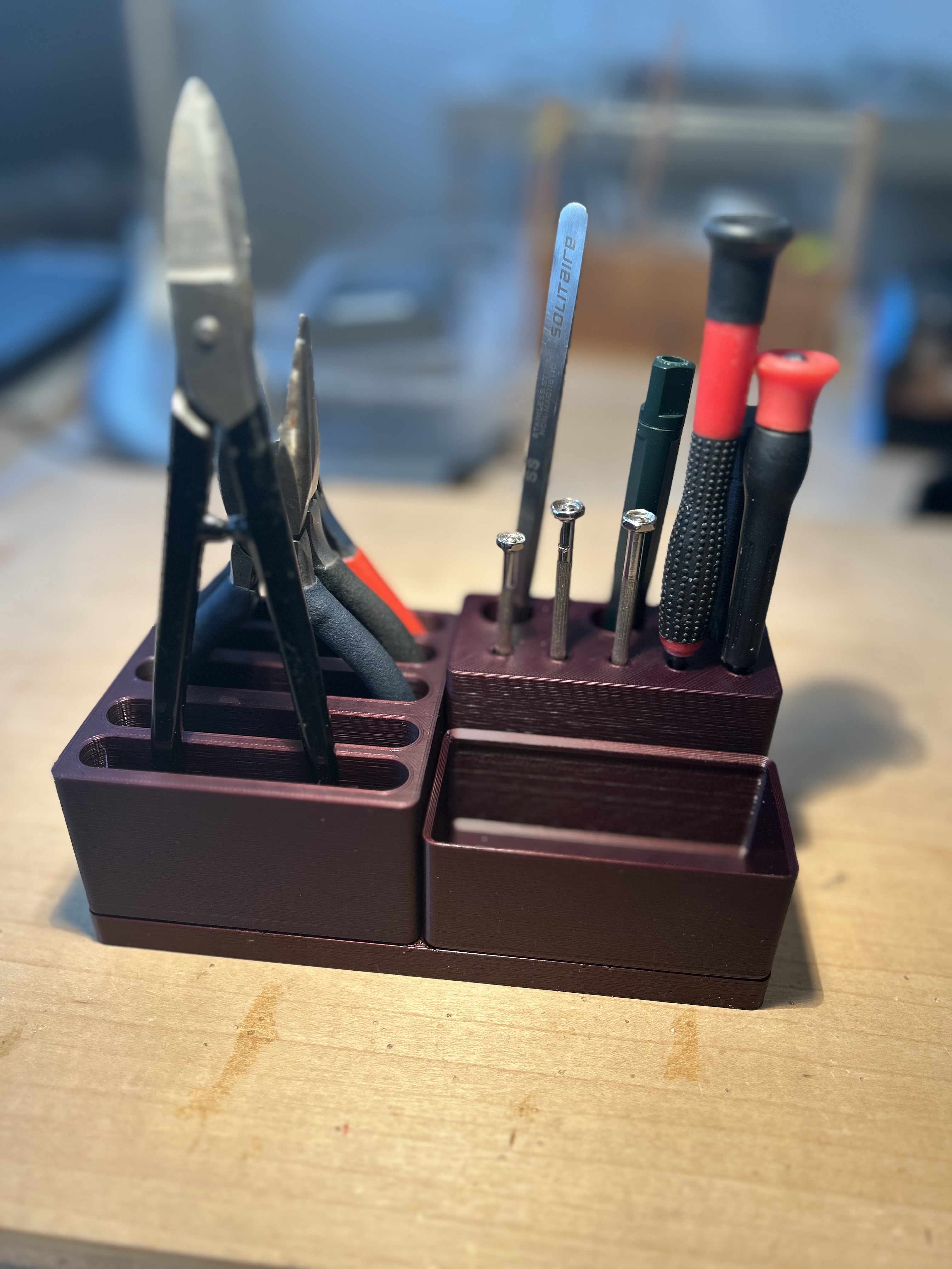 Hộp đựng đồ nghề Gridfinity tiện lợi cho việc sửa chữa, cất giữ dụng cụ và đồ linh tinh. Khung hộp có lỗ bắt vít 3.2 mm, cho phép bạn dễ dàng kết nối nhiều khung lại với nhau hoặc gắn lên đế. In bằng PLA với infill 15% và độ dày lớp 0.3 mm.