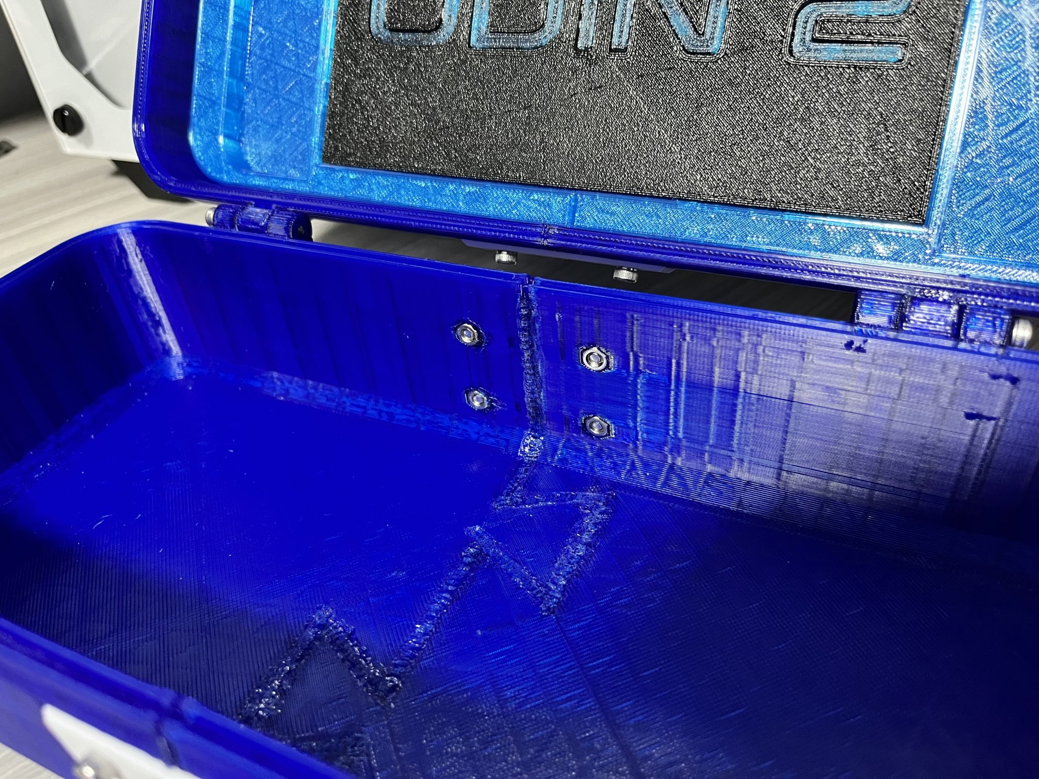 Hộp đã được thiết kế xung quanh Odin để cung cấp sự bảo vệ tốt cho nó. Bên trong hộp có một số chèn (inserts) để giữ Odin ở vị trí và vẫn cung cấp không gian lưu trữ cho phụ kiện như cáp sạc và bộ chuyển đổi. Các bộ phận tiếp xúc trực tiếp với Odin có thể được in bằng TPU để tránh trầy xước cho thiết bị và trong trường hợp bị rơi, chúng có thể hoạt động như một lớp đệm. Hộp có thể được in với logo Odin mới hoặc cũ trên nắp (tất cả các tệp đều có sẵn ở đây).