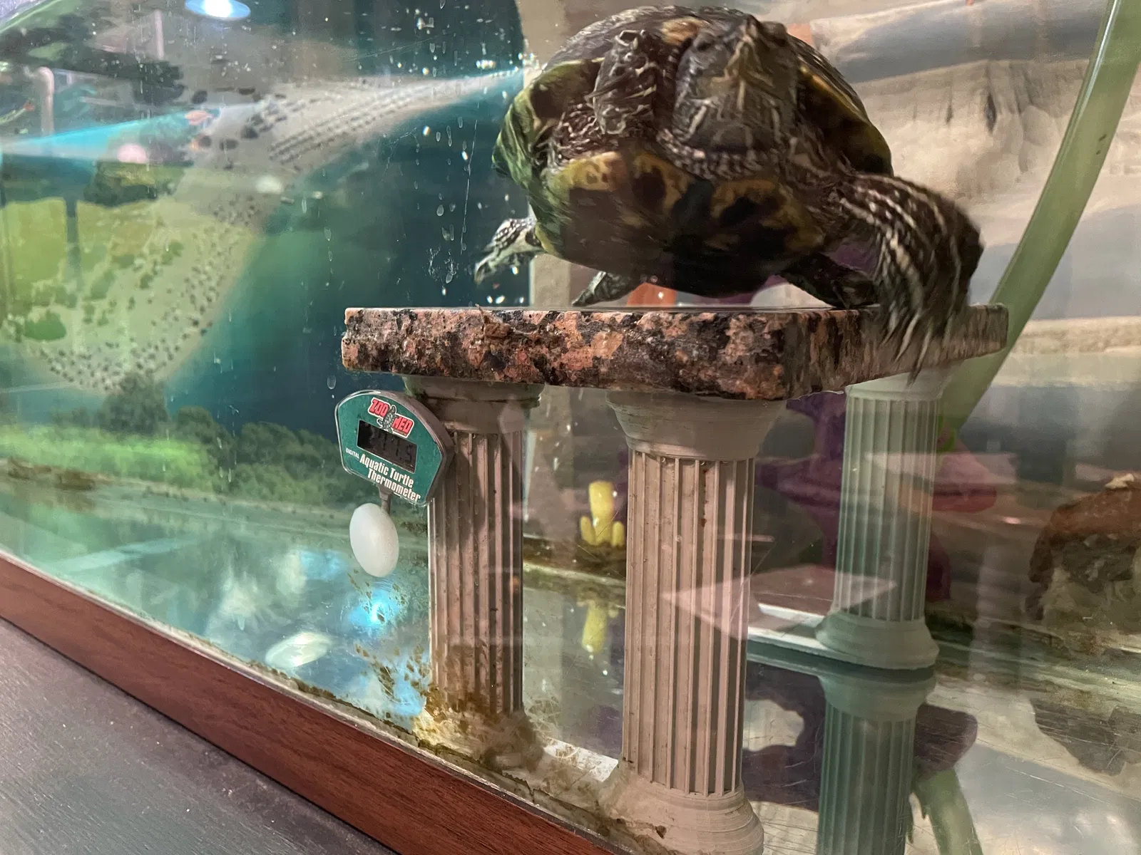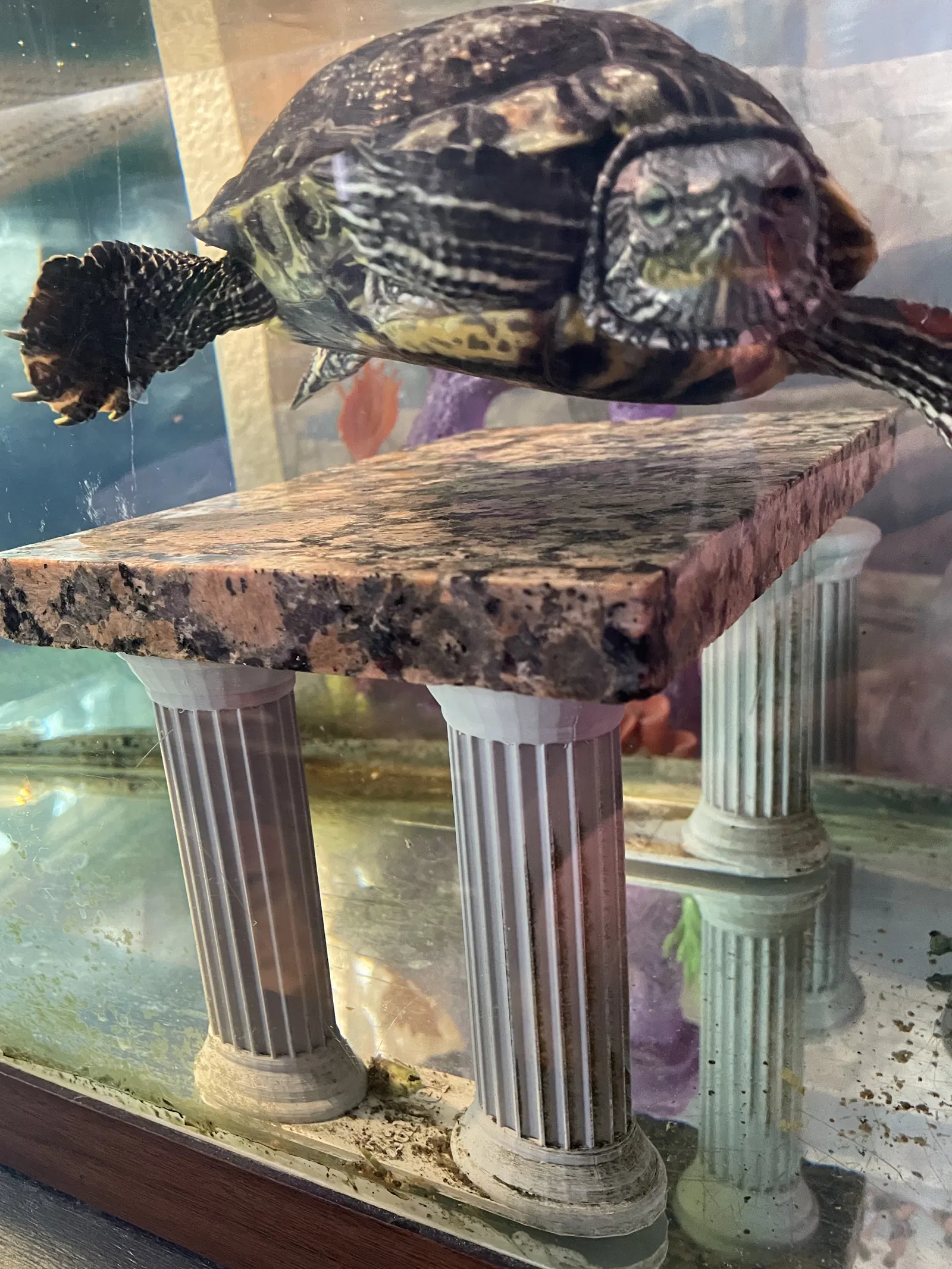 Bộ trụ này là dành cho Zander, bé rùa trong hình đó. Tên bé được khắc nổi trên đế. Bạn có thể gỡ bỏ tên này hoặc dùng nó để tưởng nhớ một bé Rùa Tai Đỏ cực kỳ dễ thương.