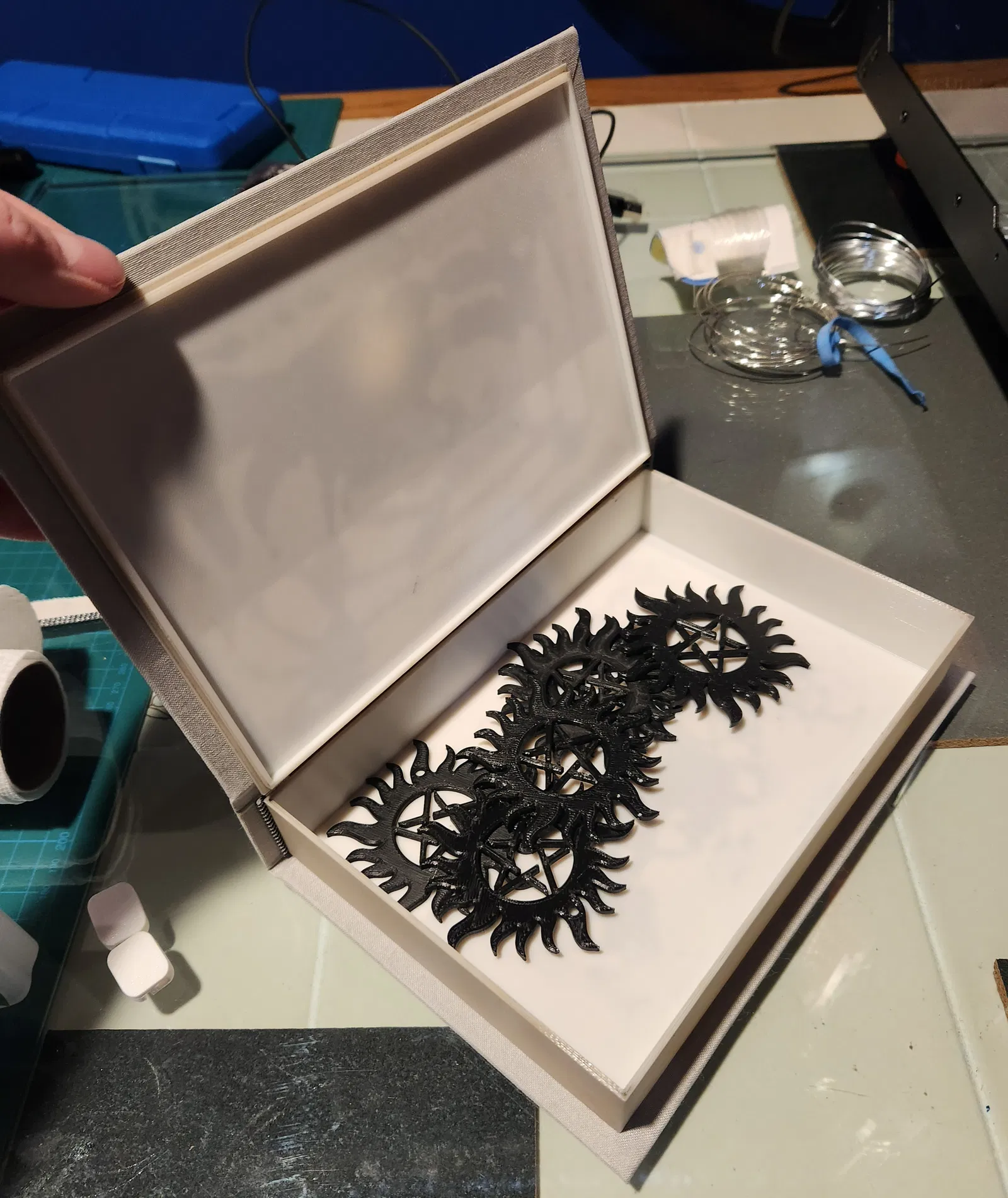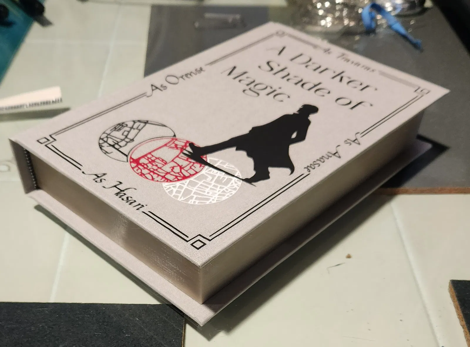 Hình ảnh minh họa được in bằng PETG tự nhiên và có lớp phủ màu Dark Walnut để trông giống như các trang mạ vàng, vì vết bẩn thích bám vào các lớp ngang. Nó được dán vào bìa bằng keo CA, chừa khoảng trống 10mm đến mép.