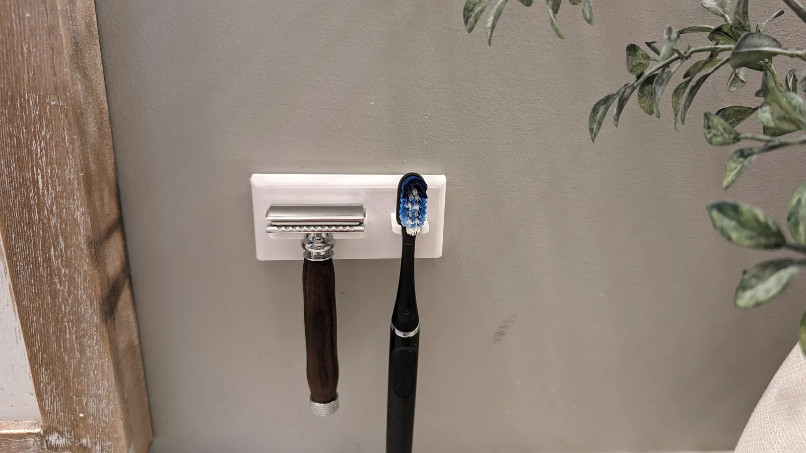 Giá đỡ bàn chải đánh răng và dao cạo gắn tường. Được thiết kế đặc biệt cho dao cạo an toàn nhưng cũng có thể dùng cho các loại dao cạo khác. Bạn có thể tùy chỉnh dựa trên dung sai của máy in. Khuyến nghị dùng vít drywall cỡ #6.