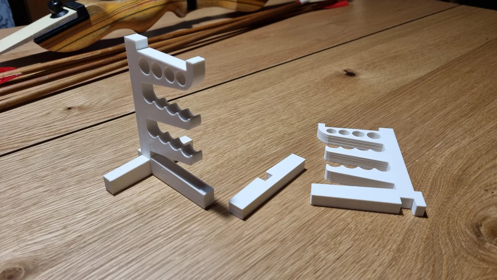 Mô hình này là một bản chỉnh sửa từ "small bow hanger" của tác giả RealBadDad, được thiết kế để bạn có thể đặt gọn gàng trên kệ sách hoặc bàn làm việc, giúp trưng bày cung và tên một cách thẩm mỹ và tiện lợi.