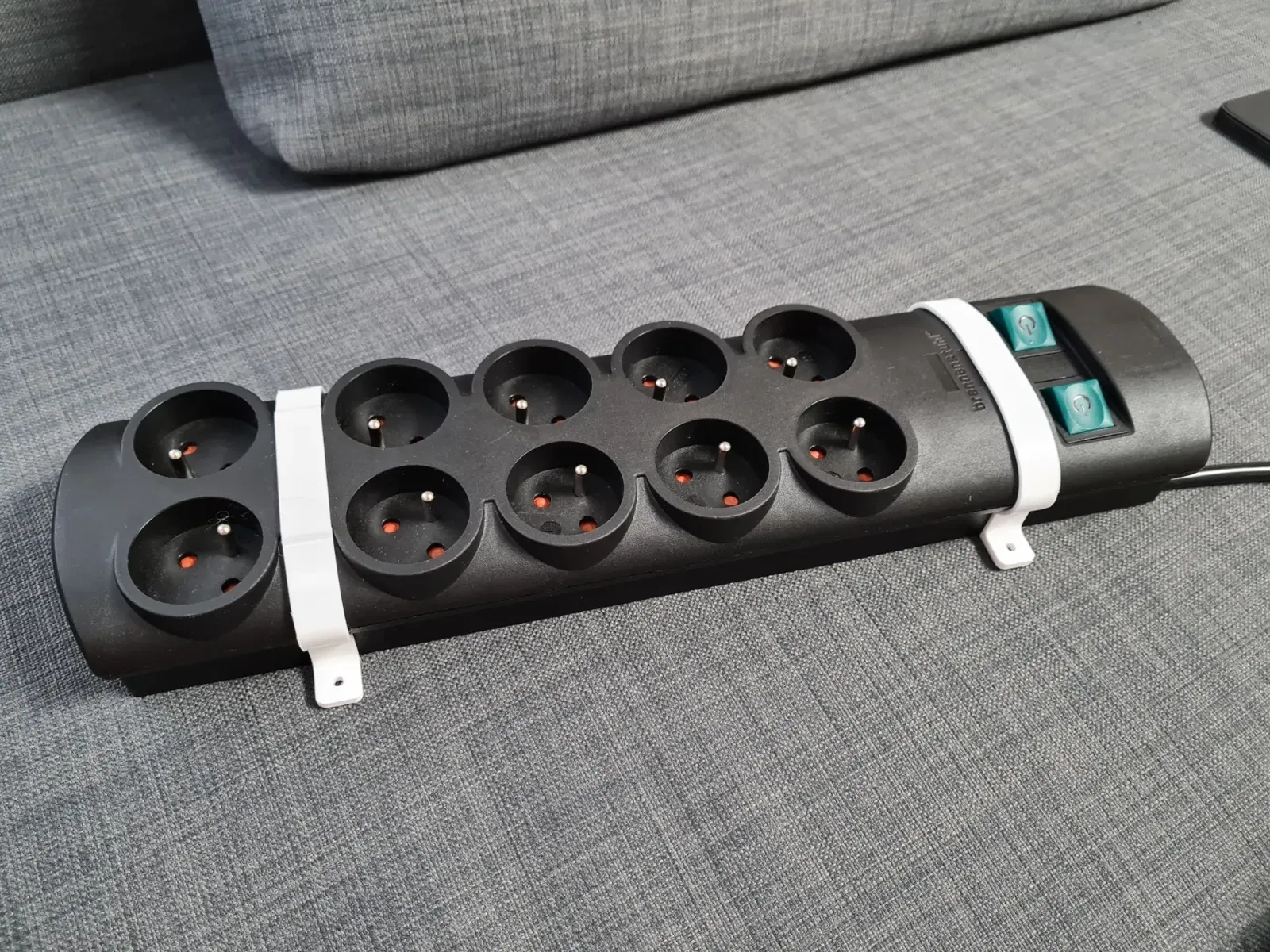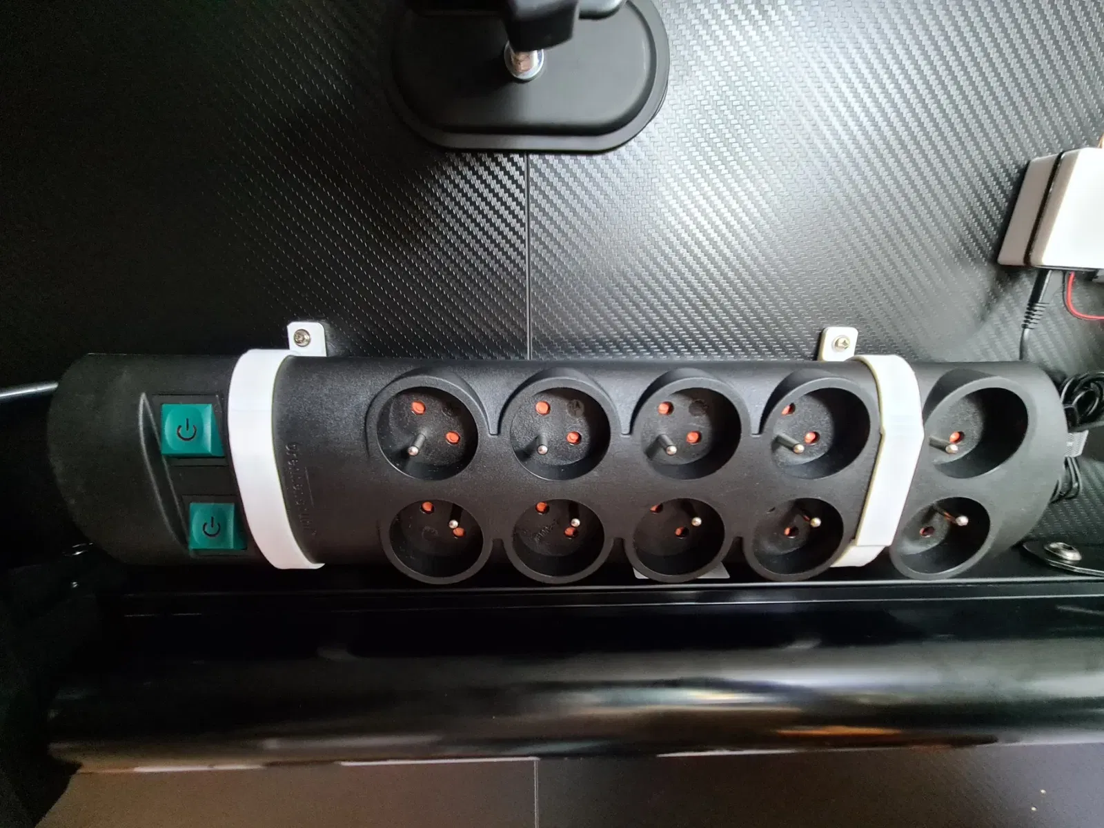 Không thể tìm thấy bất kỳ giá đỡ nào cho dải nguồn 10 ổ cắm Brennenstuhl Primera-Line, vì vậy tôi đã tạo ra một cái thật đơn giản trong Fusion. Hoạt động tốt hơn tôi mong đợi và giữ rất chắc chắn dưới mặt bàn của tôi.
