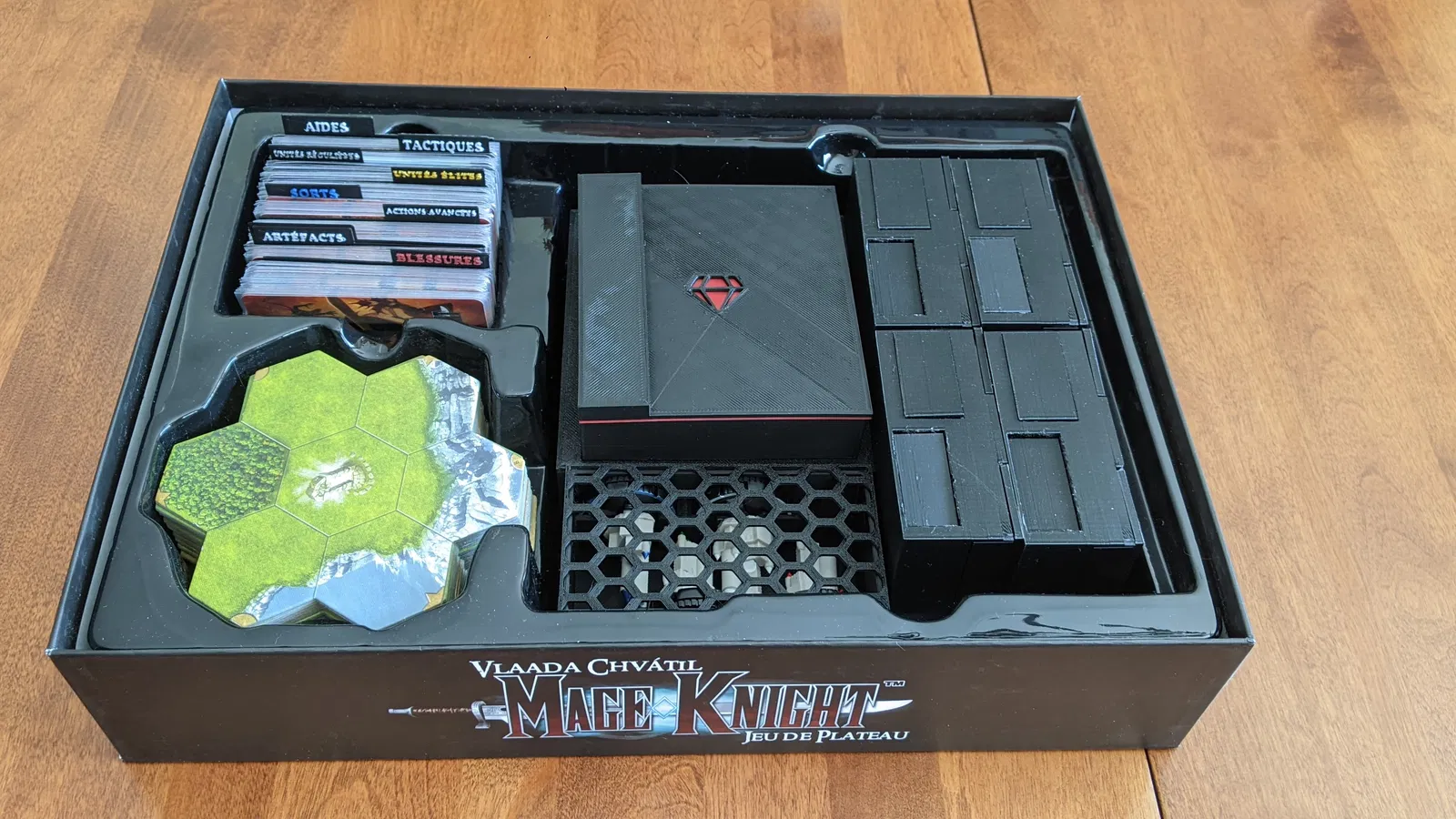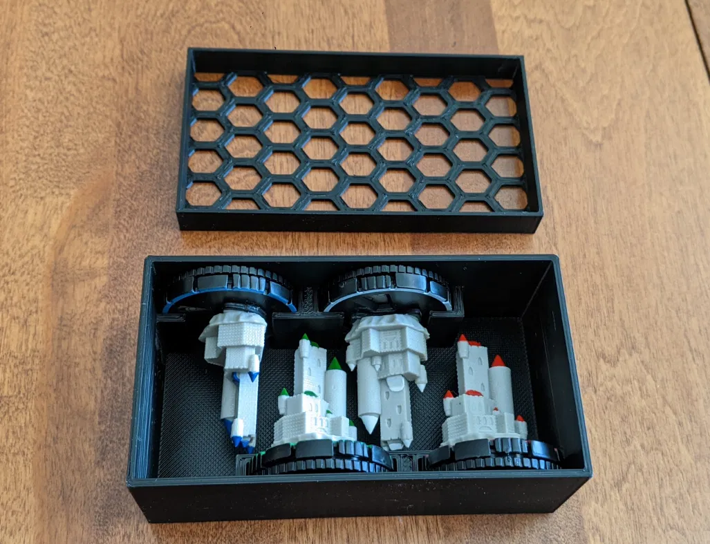 Cái khay này làm riêng để đựng mấy cái lâu đài cho game Mage Knight, dùng cho bản game gốc thôi. Thiết kế này giúp bạn sắp xếp gọn gàng mấy phụ kiện trong hộp game, có cả nắp đậy vừa khít luôn.