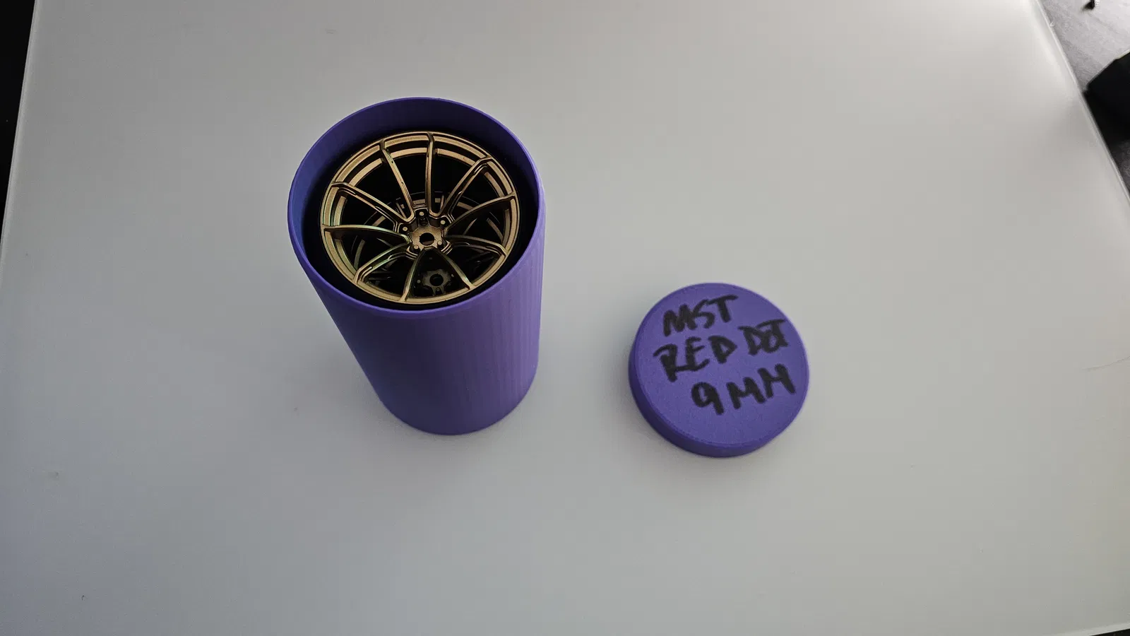 Tui muốn có cái gì đó để giữ mấy bộ bánh xe cho chiếc xe RC drift của tui. Tui có khoét mấy cái lỗ dưới đáy ống để tránh bị hút chân không nha. In với độ cao lớp là .28mm, 5 lớp tường. Nhanh mà chắc chắn.