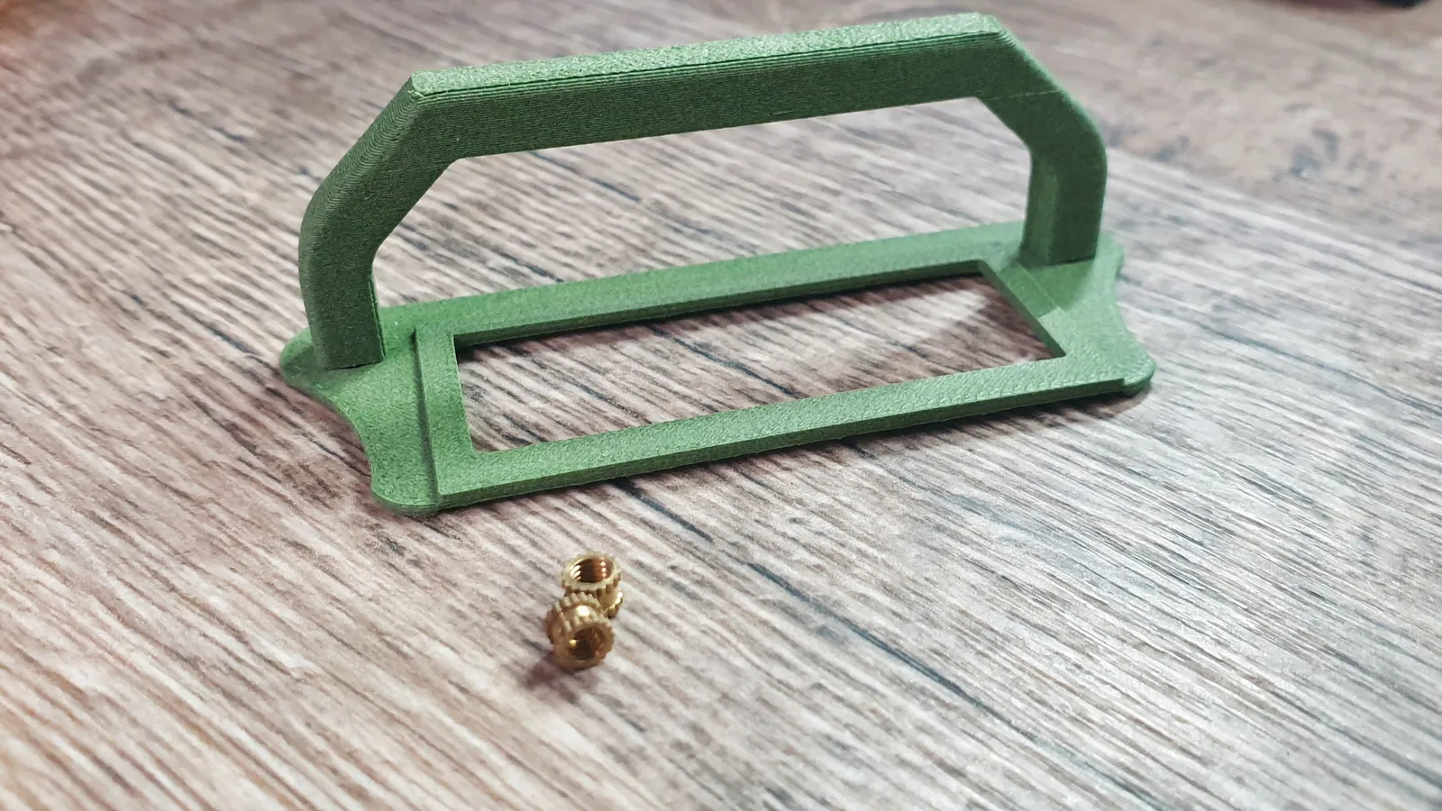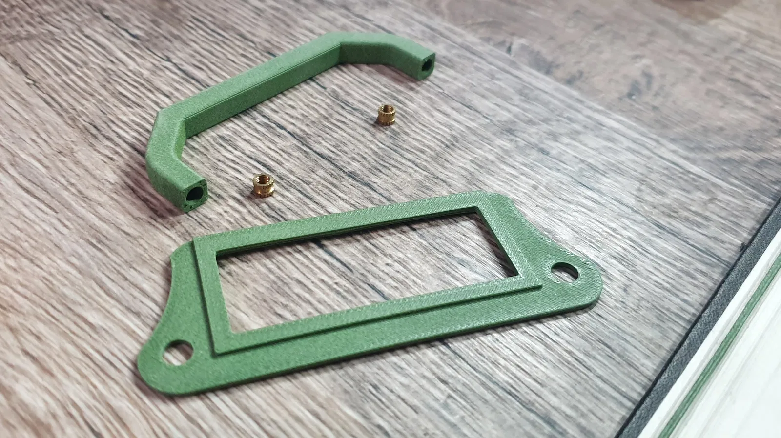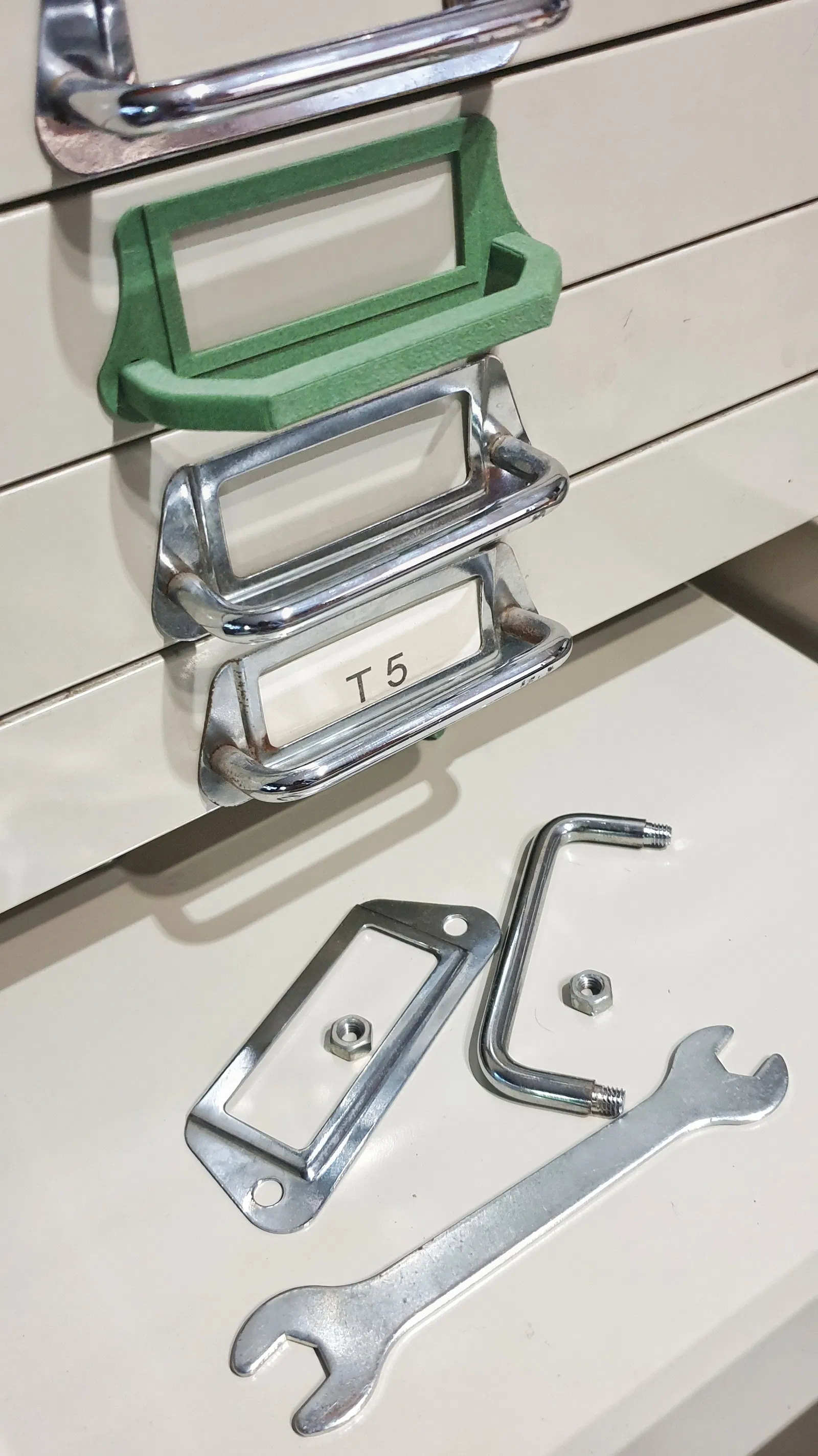 Tay nắm ngăn kéo mới, kèm theo bảng để ghi chú nội dung bên trong. Có hai lỗ cho ốc ren 3mm. Hình ảnh minh họa sử dụng nhựa PLA-CF màu xanh lá cây, trong khi ngăn kéo và tủ sẽ được sơn đen.