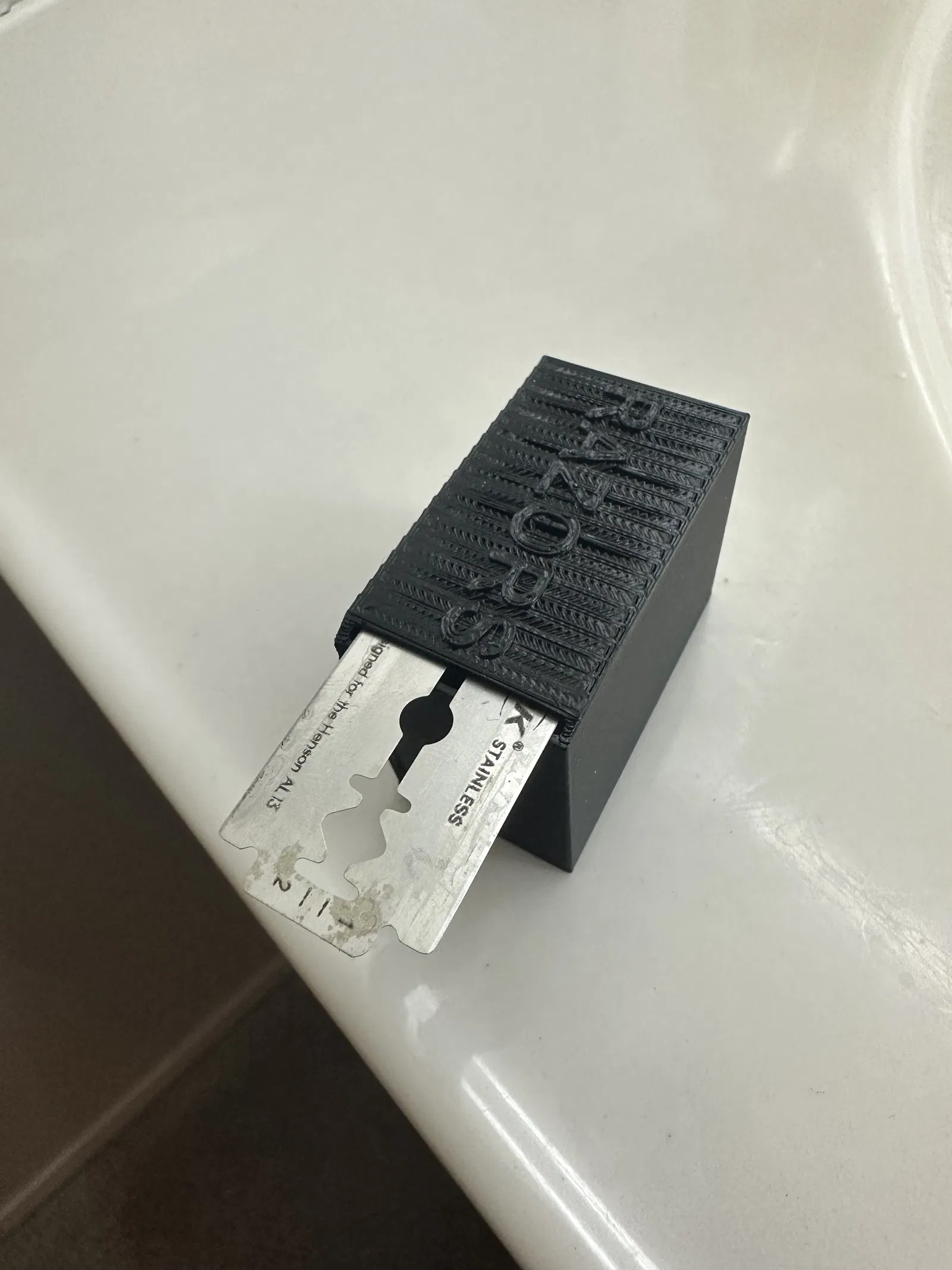 Hộp đựng an toàn cho lưỡi dao hai lưỡi dùng cho dao cạo râu an toàn. Bản chỉnh sửa của thiết kế gốc, có chốt để căn chỉnh lưỡi dao, chứa được lượng lớn lưỡi dao và có nhãn "RAZORS" trên nắp.