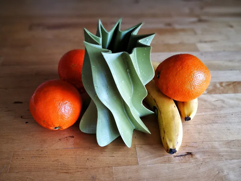 Bình hoa Jamila lấy cảm hứng từ vẻ đẹp và sự khắc nghiệt của sa mạc, cùng với các tinh thể tự nhiên như "hoa hồng sa mạc". Sản phẩm này dễ dàng in ấn mà không cần vật liệu hỗ trợ.
