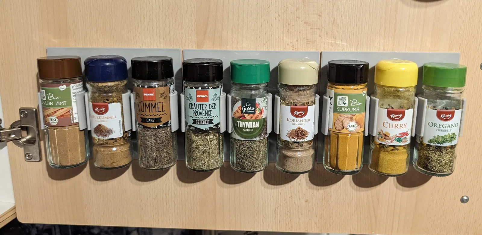 Đế đựng hũ gia vị tròn đường kính 42mm, loại hũ này phổ biến ở Đức. Sản phẩm này có thể đựng vừa khít ba hũ gia vị, hạn chế rung lắc, và được thiết kế để gắn keo nến vào cánh cửa tủ bếp. Nên in bằng PETG.