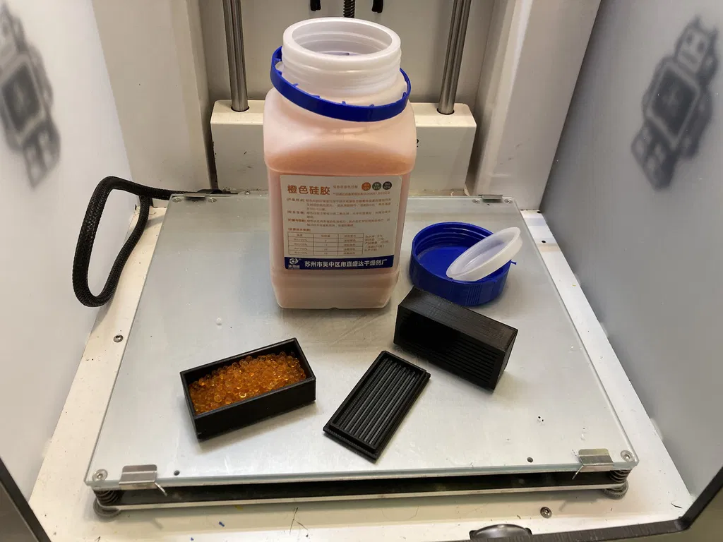 Tui lưu trữ sợi nhựa in 3D của mình trong mấy cái thùng sơn nhựa, tui đã chế tạo mấy cái hộp đựng gel hút ẩm nhỏ để giữ cho sợi nhựa luôn trong tình trạng tốt nhất. Nó hoạt động hoàn hảo, giúp giảm độ ẩm trong thùng xuống dưới 20%.