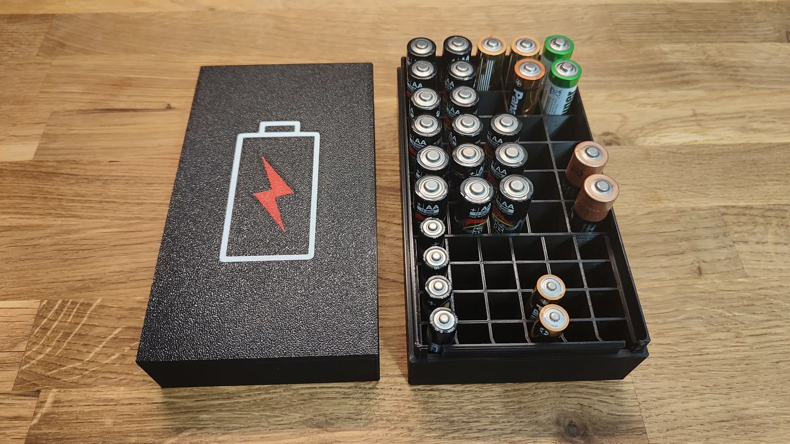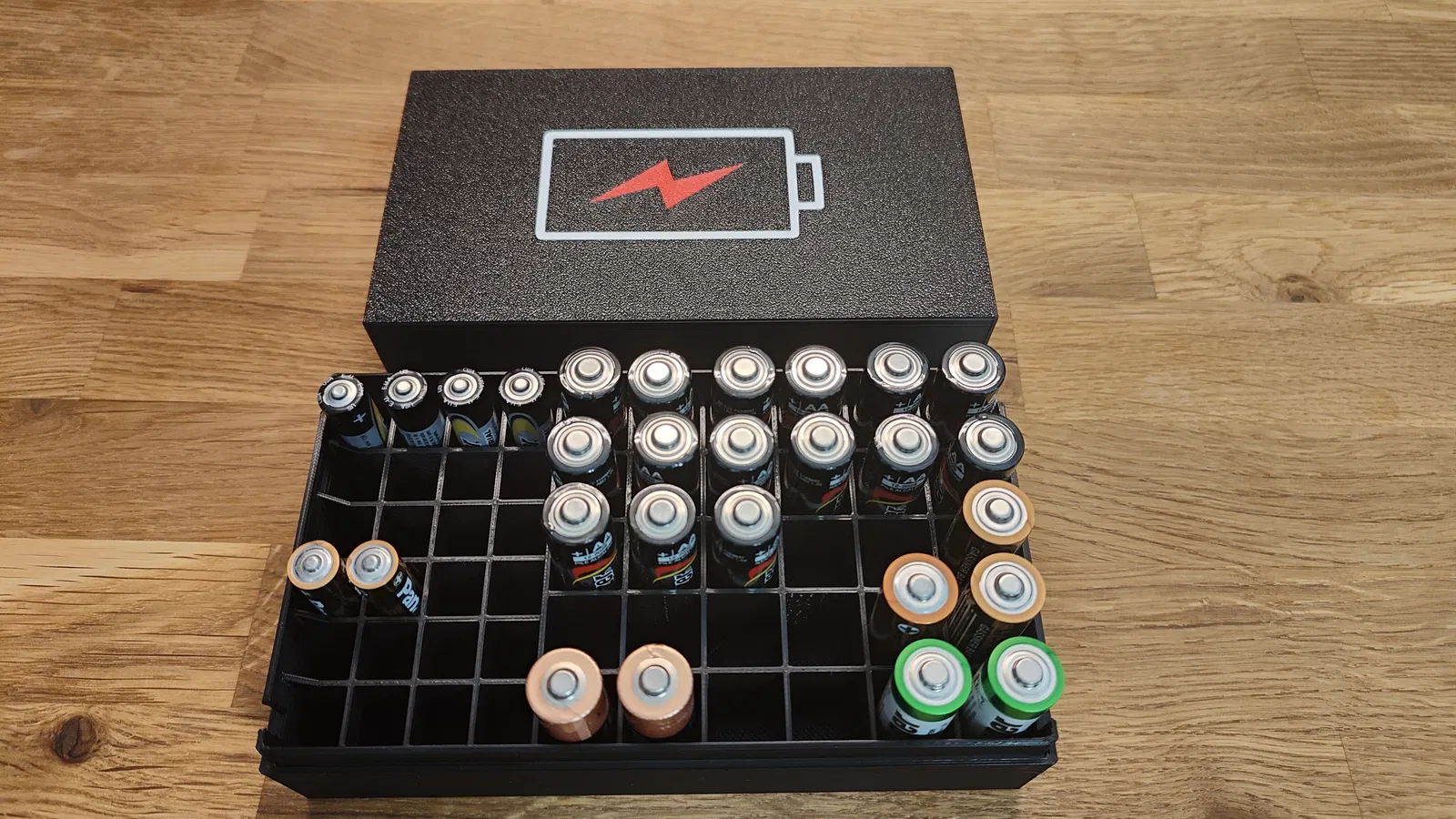 Hộp đựng pin AA và AAA, có thể chứa 24 pin AAA và 30 pin AA. Phiên bản V2 đã được cập nhật để dễ mở hơn. Cài đặt máy in gợi ý: độ cao lớp 0,2mm, 4 lớp vỏ, không hỗ trợ cho thân hộp, nên dùng hỗ trợ cho nắp có logo.