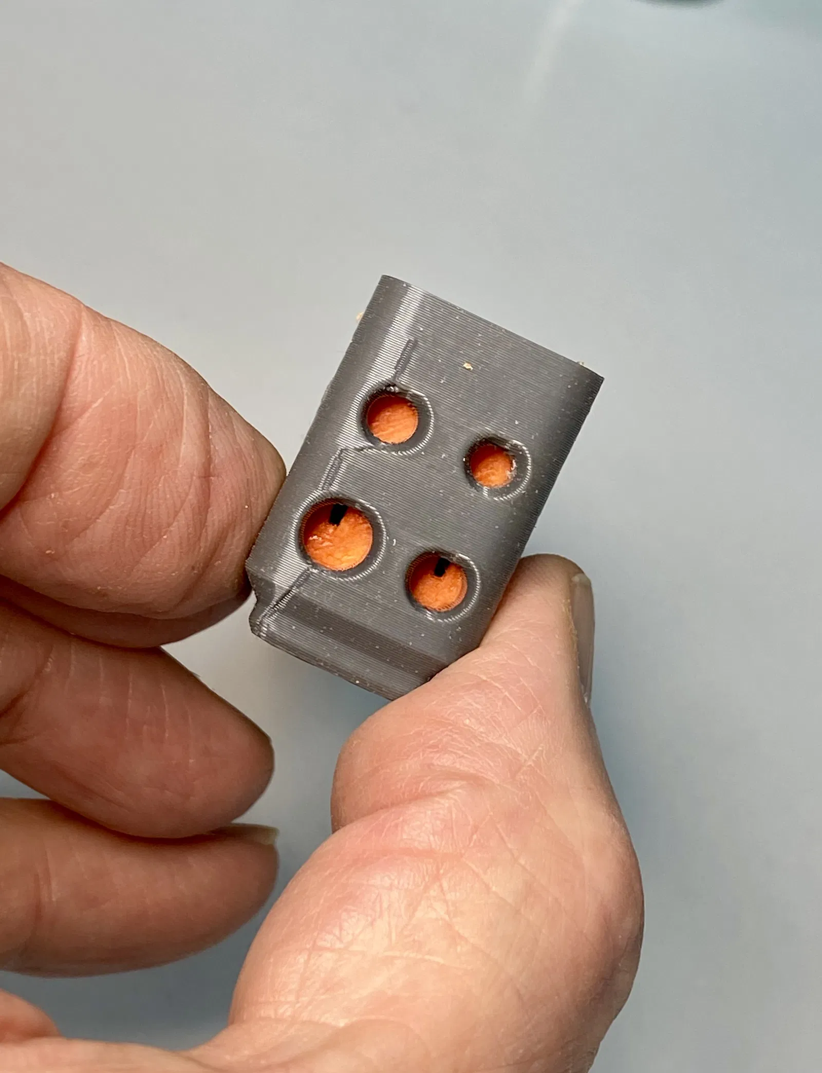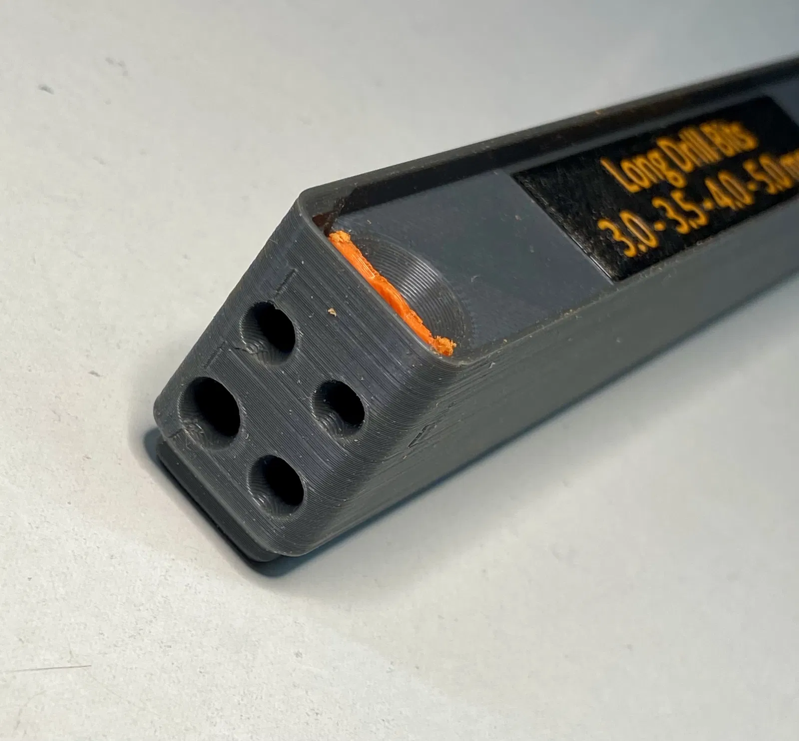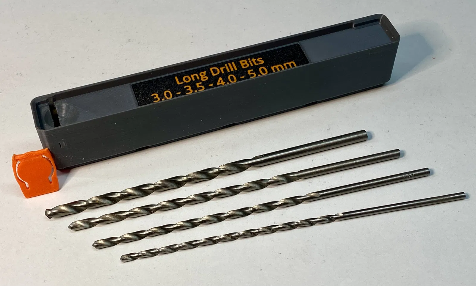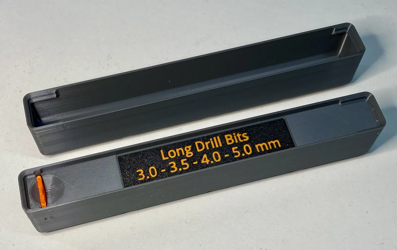 Tui cần tổ chức lại bộ dụng cụ của mình, nên sao không áp dụng hệ thống Gridfinity? Lấy số đo của bộ mũi khoan dài (Ø3.0, 3.5, 4.0, 5.0), làm các lỗ để vừa vặn thoải mái vào hộp Gridfinity 4x0.5. Kết quả rất ổn. Chiều cao phía trên lưới đã được điều chỉnh cho phù hợp. Đế hộp được lấp đầy bằng các tấm đặc, tui không thích bốn lỗ mỗi cái. Lấp đầy hoàn toàn phần đáy hộp Gridfinity. Cắt các lỗ cho mũi khoan (đường kính lớn hơn 0.6mm). Một cái "máng" lò xo nhỏ ngăn mũi khoan rơi ra. Máng trên V0.1 bằng PETG. Máng cần chút chỉnh sửa bằng dũa để trượt ra vào mượt mà. Có thể dùng tí mỡ bôi trơn để dễ dàng hơn! Làm một cái "nhãn" ghi tên và kích cỡ để trang trí/thông tin. Thiết kế bằng TinkerCad. Nhãn in bằng Prusa MK3S+ với MMU2s của tui. Tấm nền satin-texture (của Prusa) bằng PLA, với chút 3DLac. In cái này với mặt chữ úp xuống tấm nền. Chú ý cực kỳ cẩn thận với lớp đầu tiên, in chậm (50-60% tốc độ lớp đầu), đừng in quá nóng, dùng filament hoàn toàn khô. Tui in chữ trước. In chậm, kết quả rất tuyệt vời, công nhận không? Hộp in trên Prusa MK4 của tui. Cũng in thêm một hộp 0.5x4 nữa để chiếm trọn 1 bộ 4x1 lưới. Sau khi in xong, tui dùng UHU để dán cái nhãn vừa khít vào chỗ lõm của nó. Xem thêm các mẫu in khác của tui: https://www.printables.com/de/@Tritschi