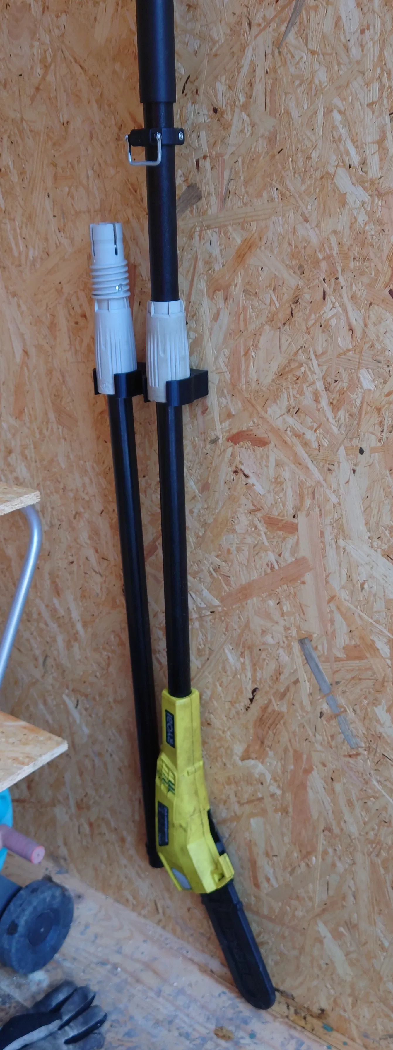 Giá treo tường cho cây tỉa cành Ryobi OPP 1820. Có chỗ cho cả dụng cụ và cây nối dài.