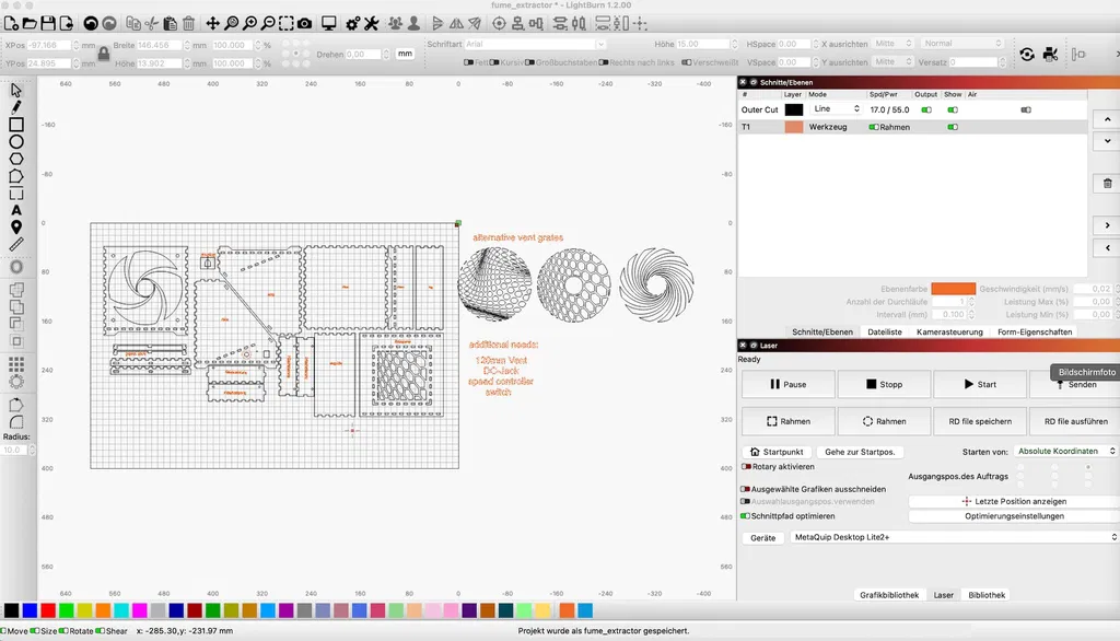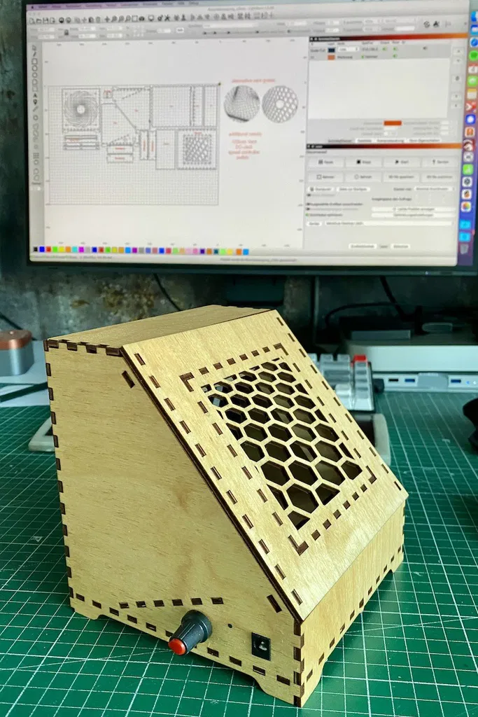 Hệ thống hút khói làm bằng máy cắt laser từ gỗ bạch dương 3mm, chuyên dùng cho công việc hàn. Bản vẽ chi tiết cho quạt 120mm, kèm tùy chọn lưới thông gió và cơ chế khóa chốt lò xo. Cần bổ sung quạt, bộ điều khiển tốc độ, than hoạt tính và phích cắm.