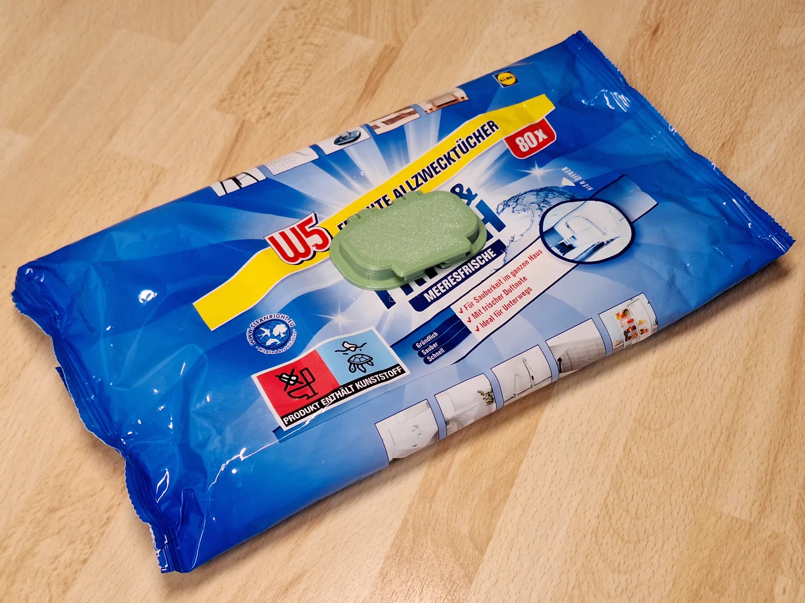 Nắp đậy kiểu snap-on này thay thế cho nắp băng keo "gaffer tape" đơn giản mà gói khăn ướt thường đi kèm. Nó giải quyết vấn đề là các "nắp" ban đầu không còn dính tốt sau khi lấy ra vài miếng khăn, khiến phần còn lại bị khô và không dùng được.