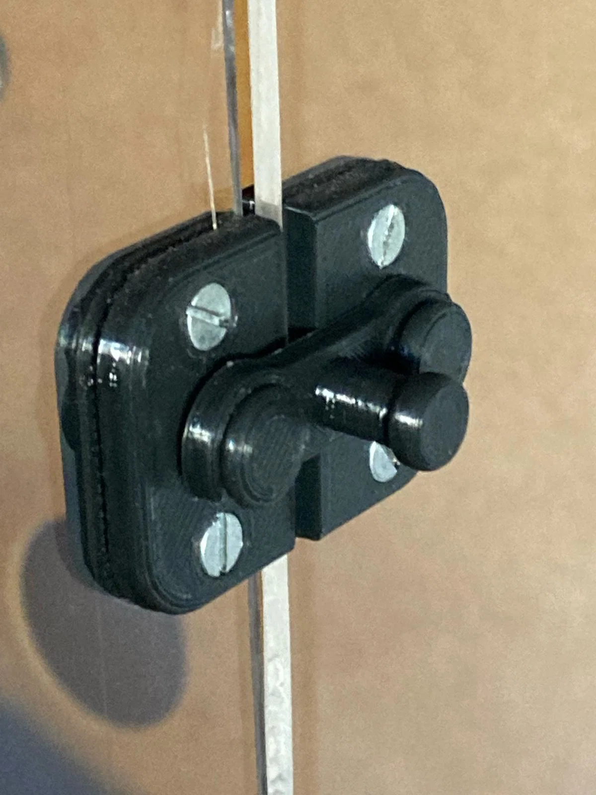 Chốt cửa nhỏ gọn dùng cho tủ kính hoặc các ứng dụng tương tự. Sản phẩm này được in thử nghiệm bằng PLA+ cho kết quả tốt, tuy nhiên PETG được khuyến nghị để tăng độ tin cậy cho bộ phận chốt.