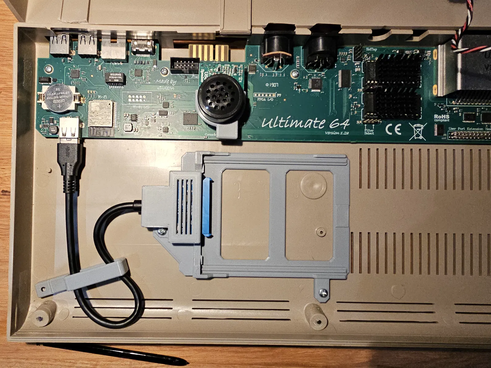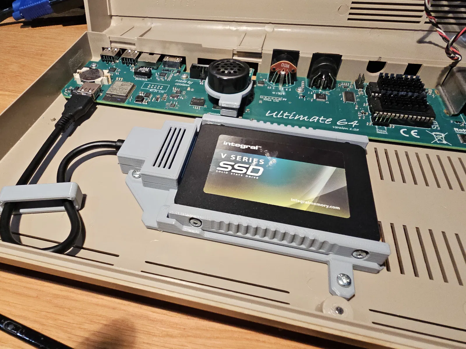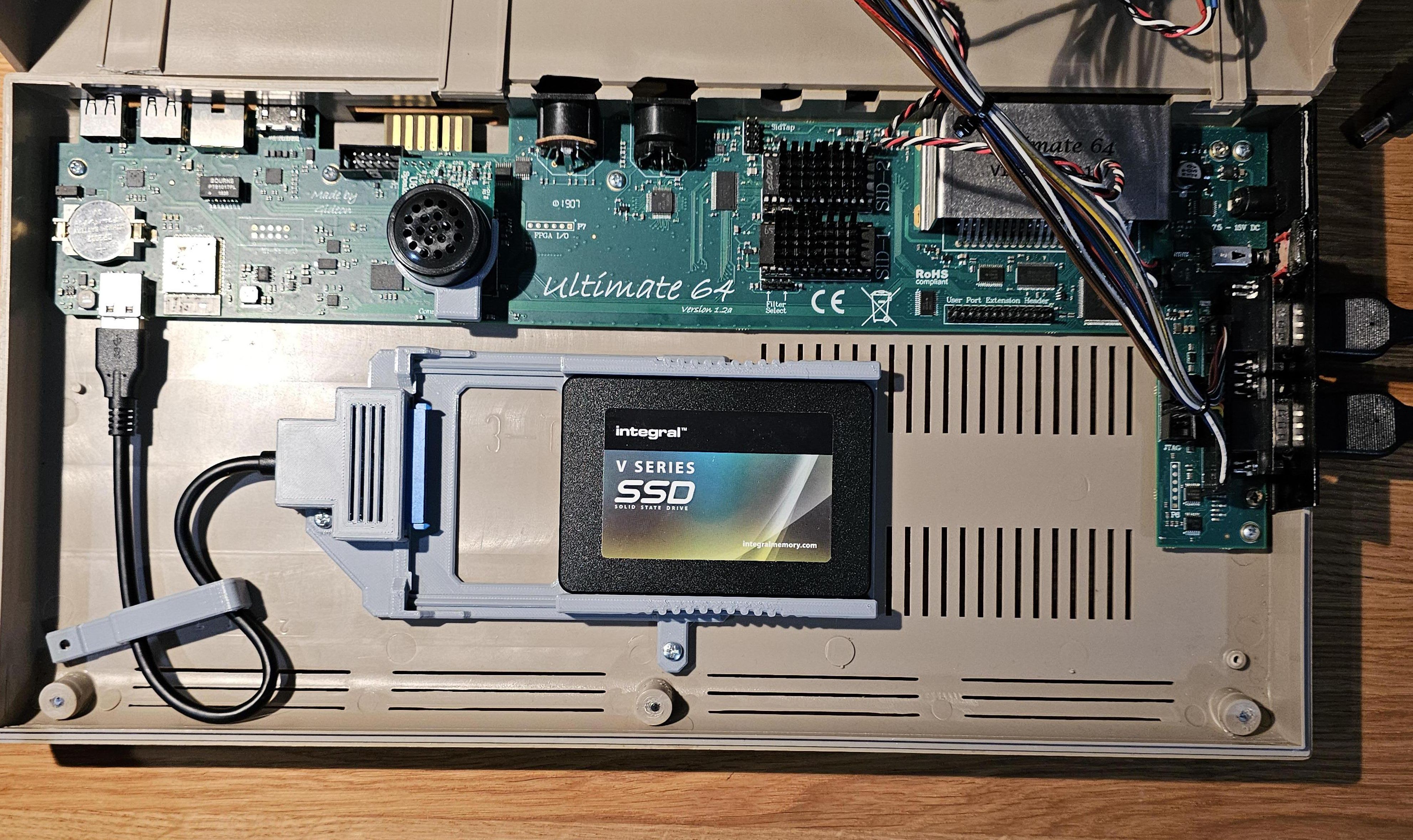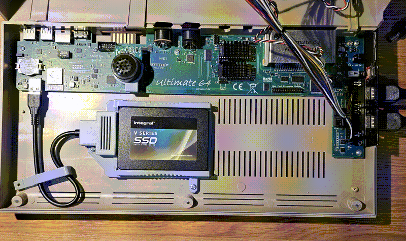 Cái bracket này sử dụng bo mạch từ adapter USB 2.0 sang SATA thông thường và biến nó thành một giải pháp gọn gàng, ngăn nắp để gắn SSD của bạn vào trong vỏ C64 Breadbin. Cái SSD Sled cho phép bạn tháo SSD ra khỏi vỏ máy một cách nhanh chóng và gắn nó với adapter tương tự vào PC của bạn để chuyển dữ liệu.