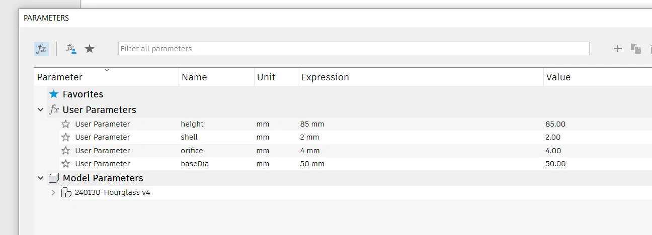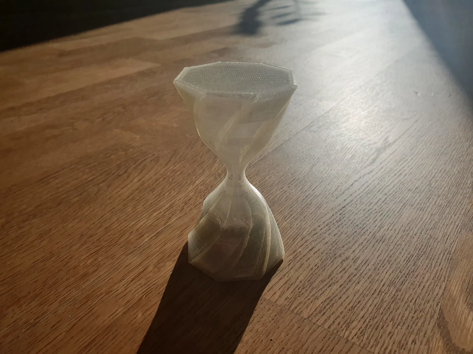 Mô hình đồng hồ cát thiết kế trên Fusion 360, với thành dày 2mm. Thích hợp để làm đồ chơi bàn làm việc hoặc làm vật trang trí. Có thể dùng bi thép, cát khô, kê, hạt silica gel hoặc các loại hạt tròn khác làm "cát" bên trong. Hướng dẫn cách kiểm tra kích thước lỗ phù hợp để "cát" chảy đều.