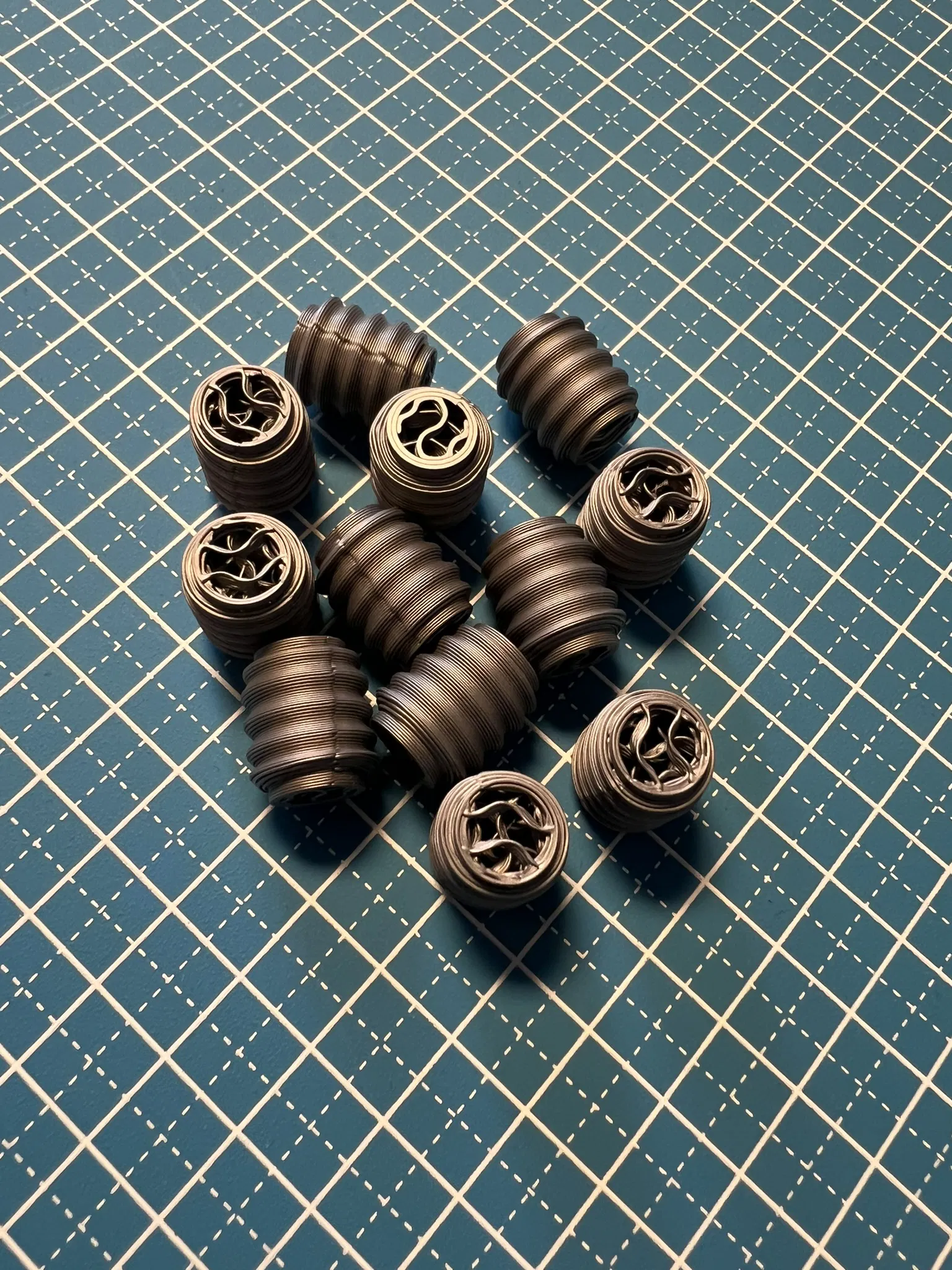 Chỉ dùng PLA hoặc PETG! In với chiều cao lớp 0.28 mm để có bề mặt nhám, không có lớp trên và dưới và mật độ ruột 15% dạng gyroid. In càng nhiều càng tốt nhưng hãy để chúng di chuyển được, đừng nhét quá nhiều vào bộ lọc để nước có thể chảy qua. Lý tưởng cho những lần in cuối cùng của sợi filament.