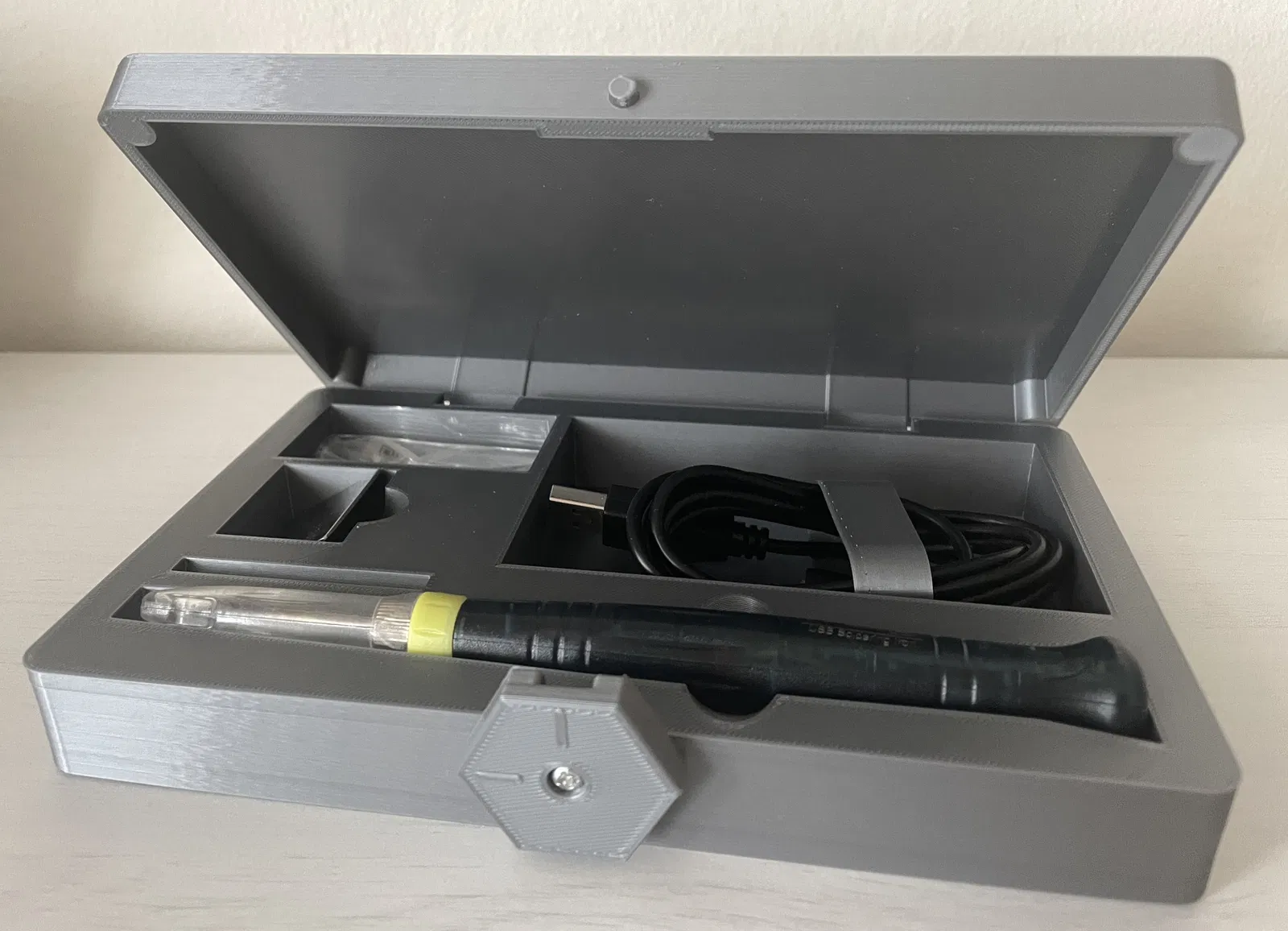 Một cái hộp đơn giản cho mỏ hàn USB, nơi bạn có thể cất giữ và lấy phụ kiện ra vào dễ dàng. Cái hộp này tui làm cho cái mỏ hàn USB này nè, có bán trên Amazon đó.