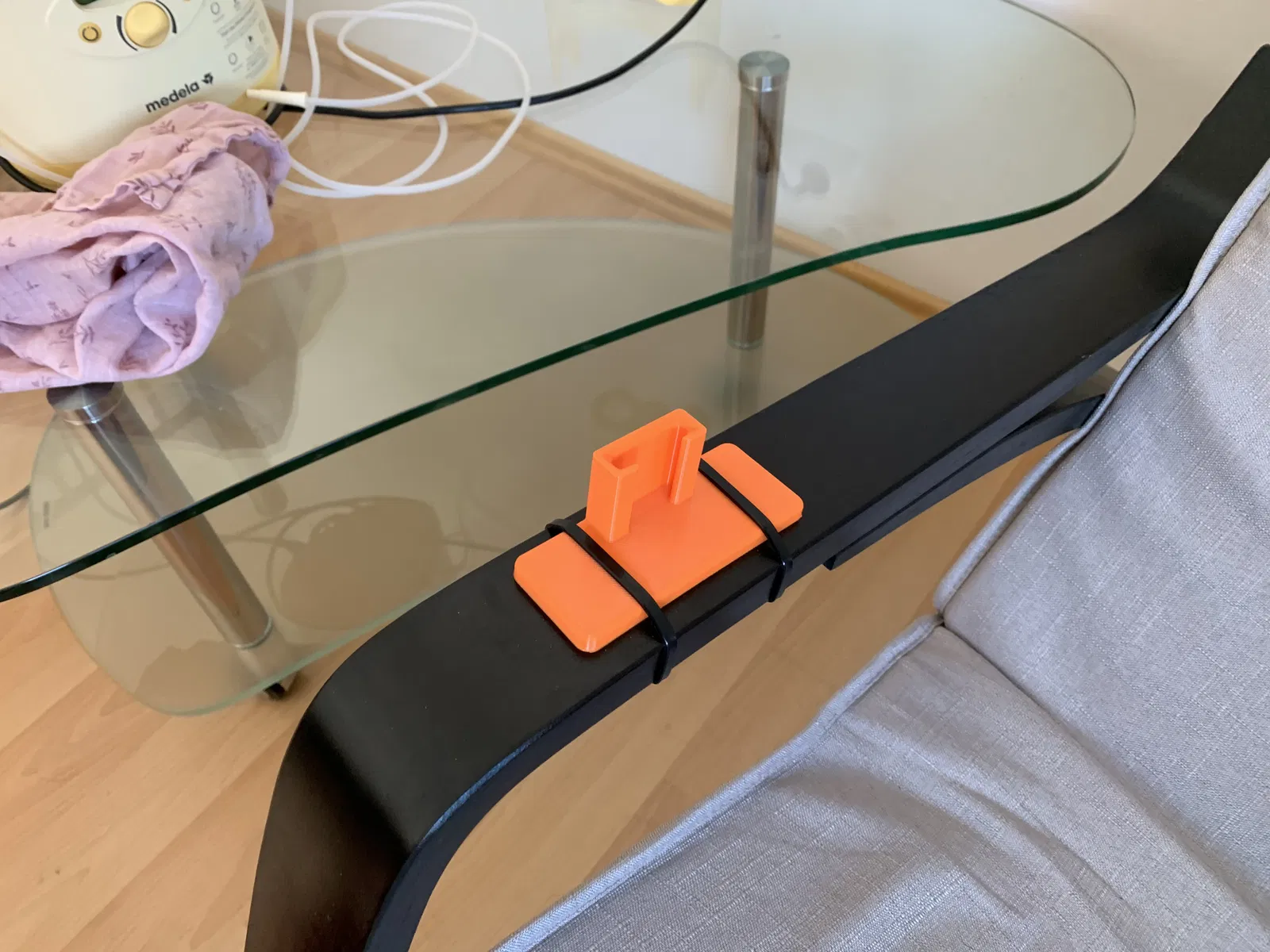 Cái này là cái đế để giữ cốc của máy hút sữa Medela đó bà con ơi. Có thể bắt vít cố định hoặc treo tạm bằng dây rút nha, tiện lợi lắm luôn.