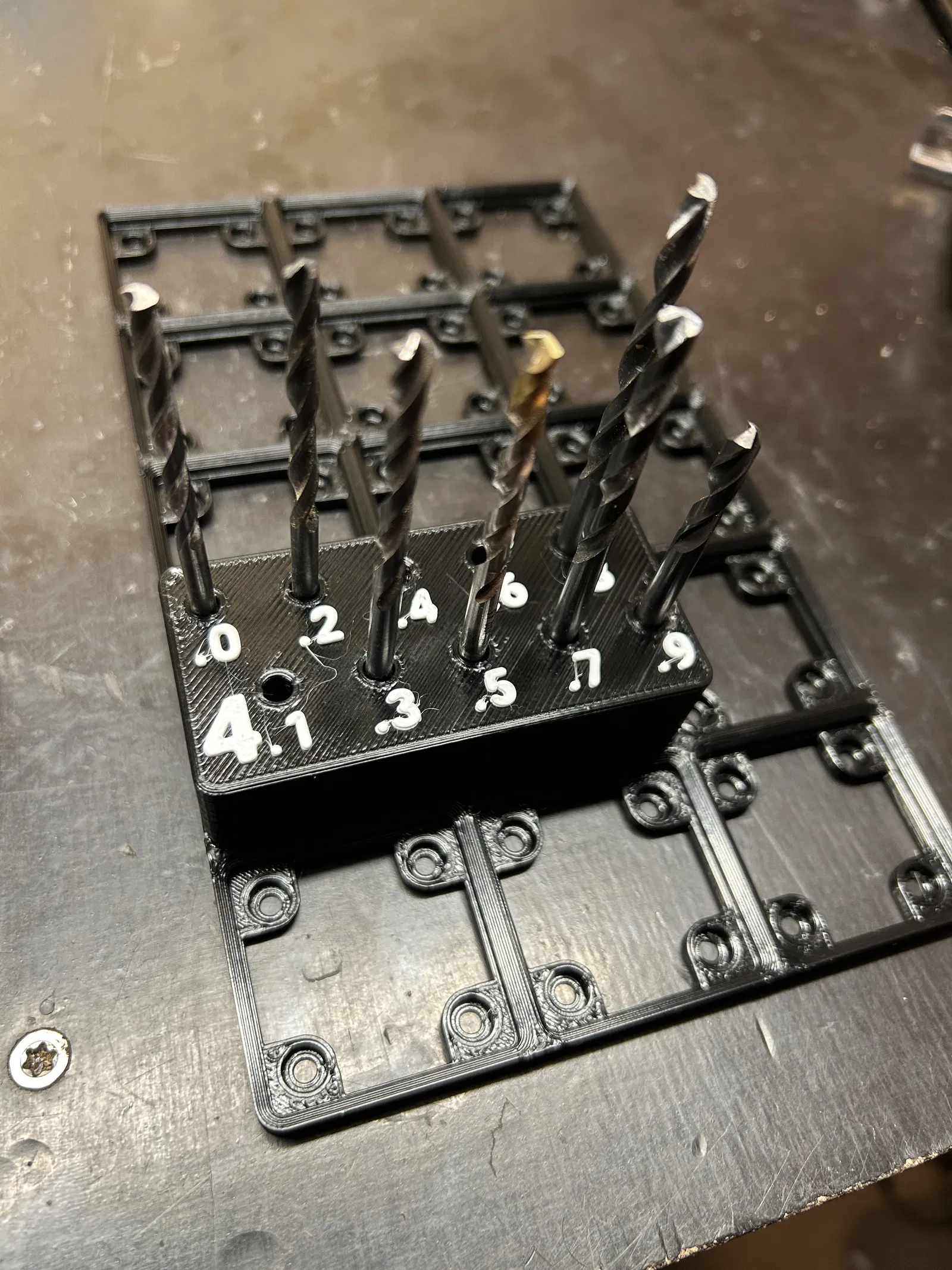 Tôi muốn có một bộ đế giữ Gridfinity cho bộ mũi khoan tiêu chuẩn (metric) đầy đủ của mình, mà tìm hoài không thấy, nên tôi tự làm lấy. Nó có sẵn cho mũi khoan lên đến 9mm, theo các bước tăng dần 0.1mm. Bạn có thể đổi màu ở các lớp cuối để có chữ hiển thị đẹp mắt và tương phản.