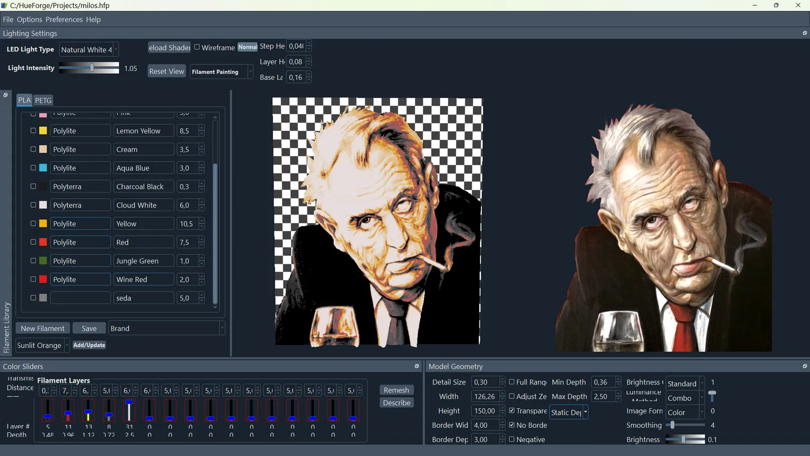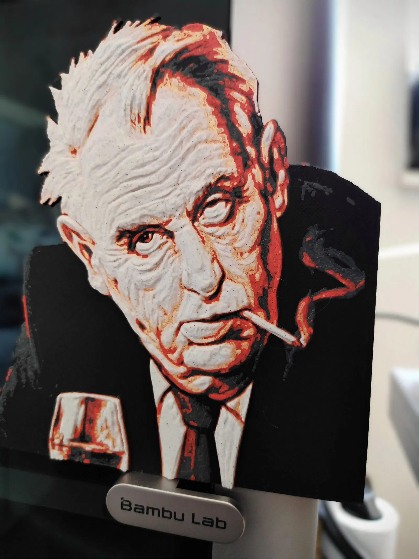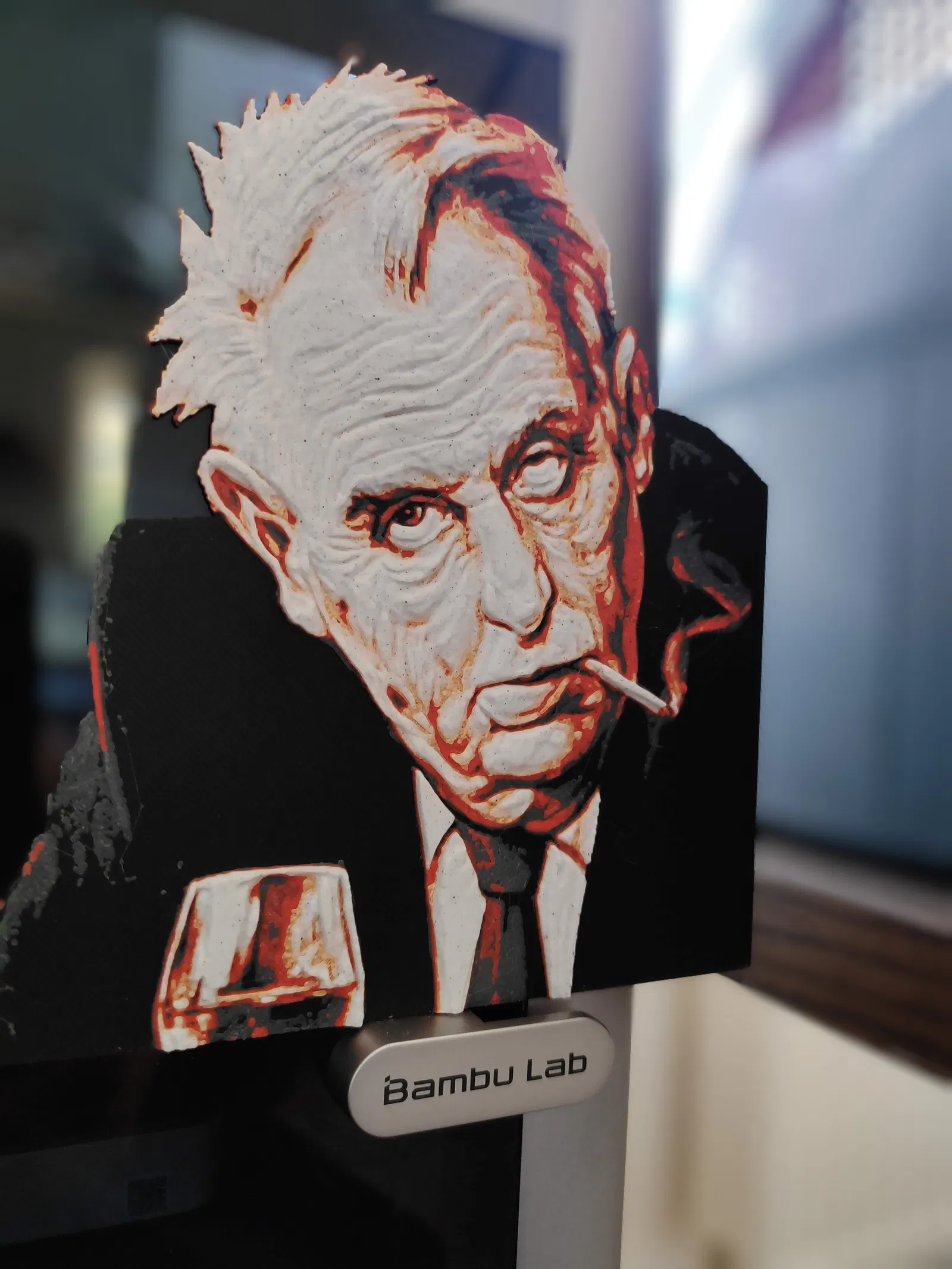 Mô hình này, 'Điếu thuốc cuối cùng của Miloš', được tạo bằng Hueforge, một phần mềm in 3D màu sắc sáng tạo. Dù bạn nhìn từ góc độ nào, đôi mắt của Miloš sẽ luôn dõi theo bạn. Hoàn hảo cho những ai muốn thêm một chút độc đáo và biểu tượng văn hóa vào không gian của mình.