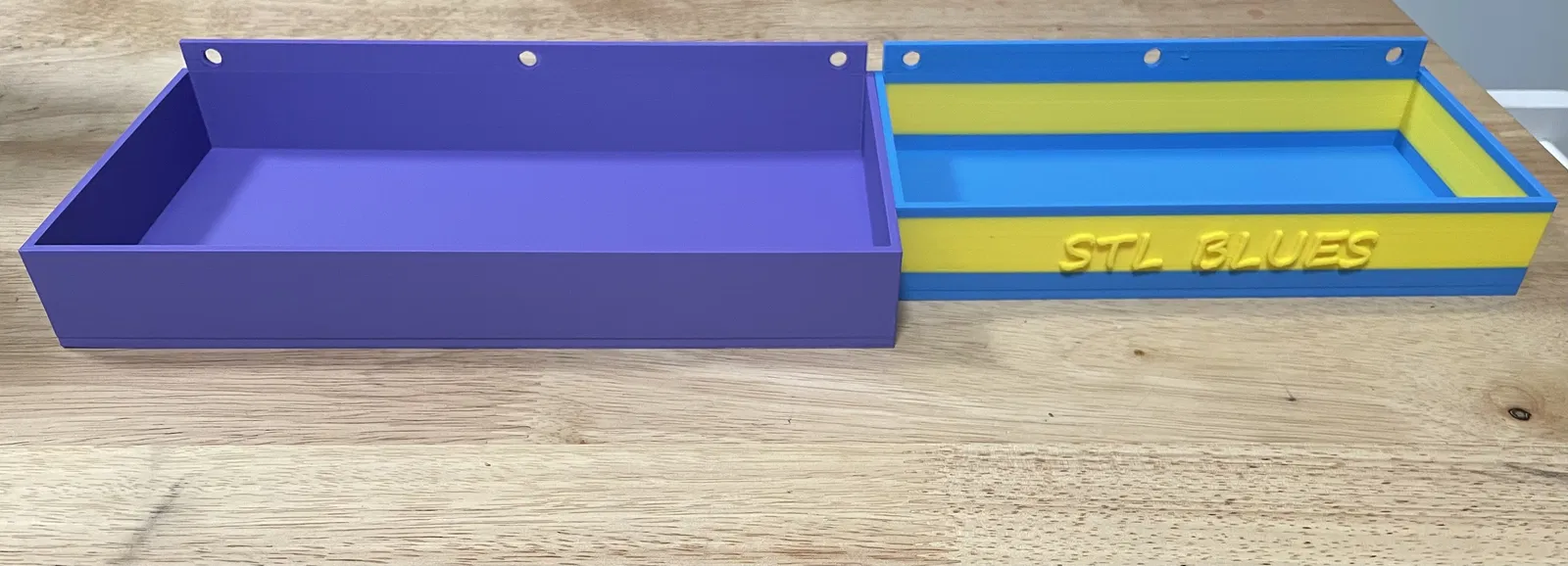 Kệ nhỏ gọn có thành kệ, tui thiết kế để đựng đồ lặt vặt trong camper. Có 3 phiên bản với các tùy chọn treo khác nhau: lỗ 1/4 inch, lỗ vặn vít, hoặc không lỗ dùng băng dính 2 mặt. Có thêm phiên bản lớn hơn.