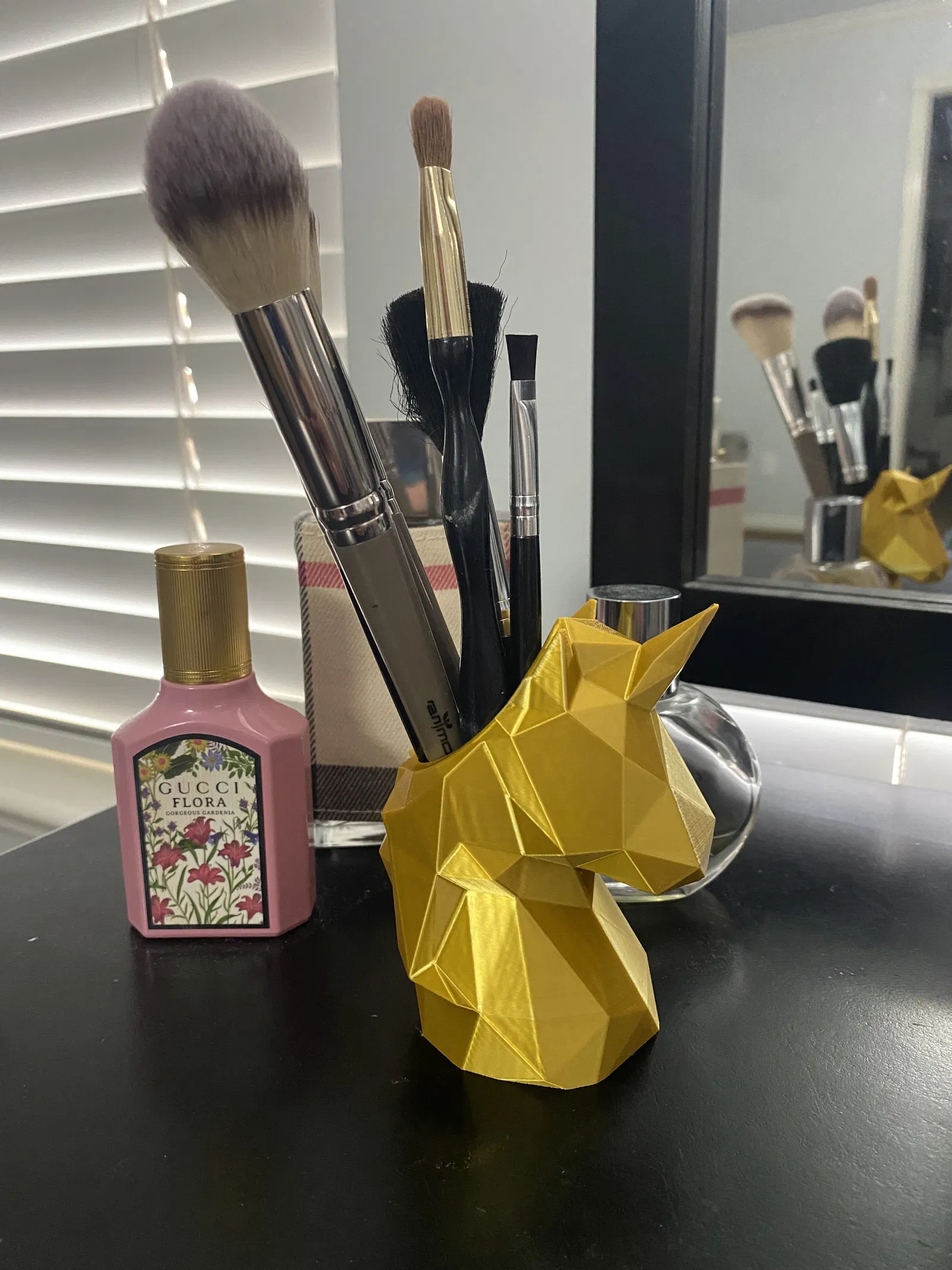 Tượng kỳ lân ít góc cạnh được chỉnh sửa để làm đế cắm bút, bàn chải đánh răng hoặc các vật dụng nhỏ khác. Mô hình này được in bằng PLA với độ đặc 15% và yêu cầu tree supports cho phần mũi và bờm.