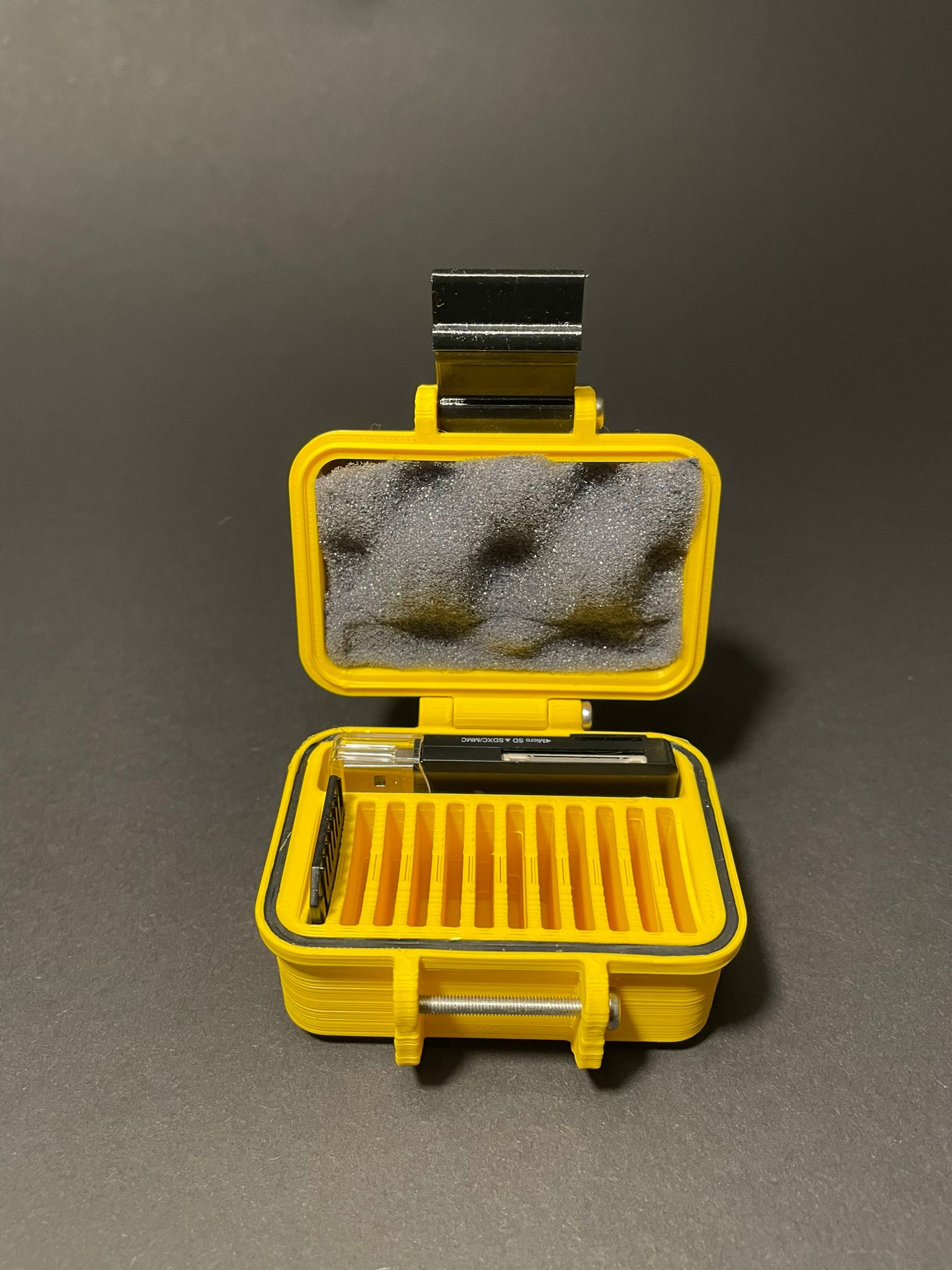 Hộp đựng thẻ SD cứng cáp, bảo vệ khỏi bụi và cát, chứa được 12 thẻ SD + đầu đọc, có tùy chọn gioăng và thiết kế module. In bằng PETG/TPU, dùng ốc M3x30 và mút xốp lót.