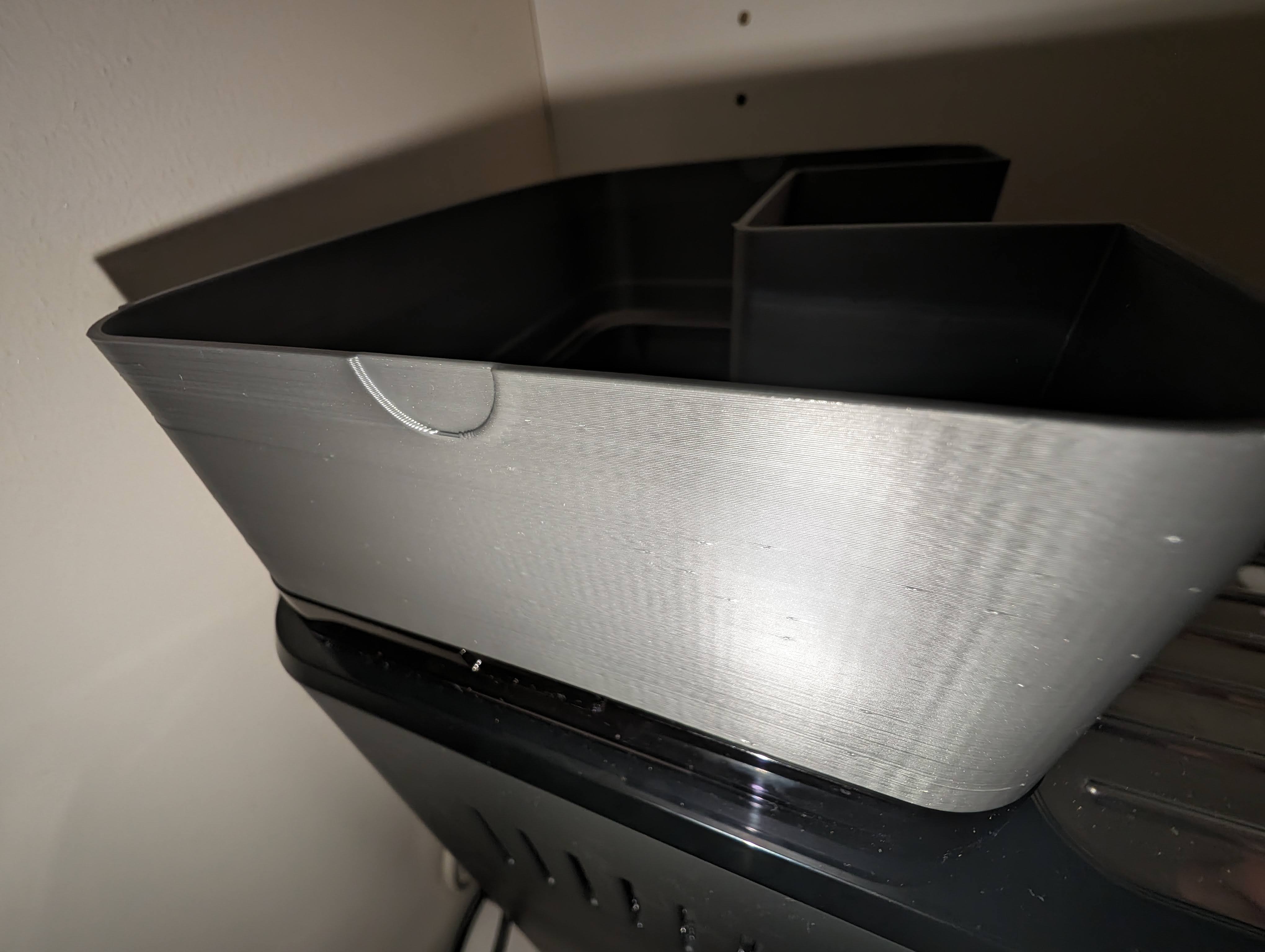 Phần nối dài cho Delonghi Eletta Explore. Phần nối dài có các móc nhỏ nên giữ chắc chắn. Tuy nhiên, tui khuyên là nên thêm một miếng băng dính nữa cho chắc ăn (chứ không ai muốn dọn hết cà phê đổ trên sàn đâu ha ;)).