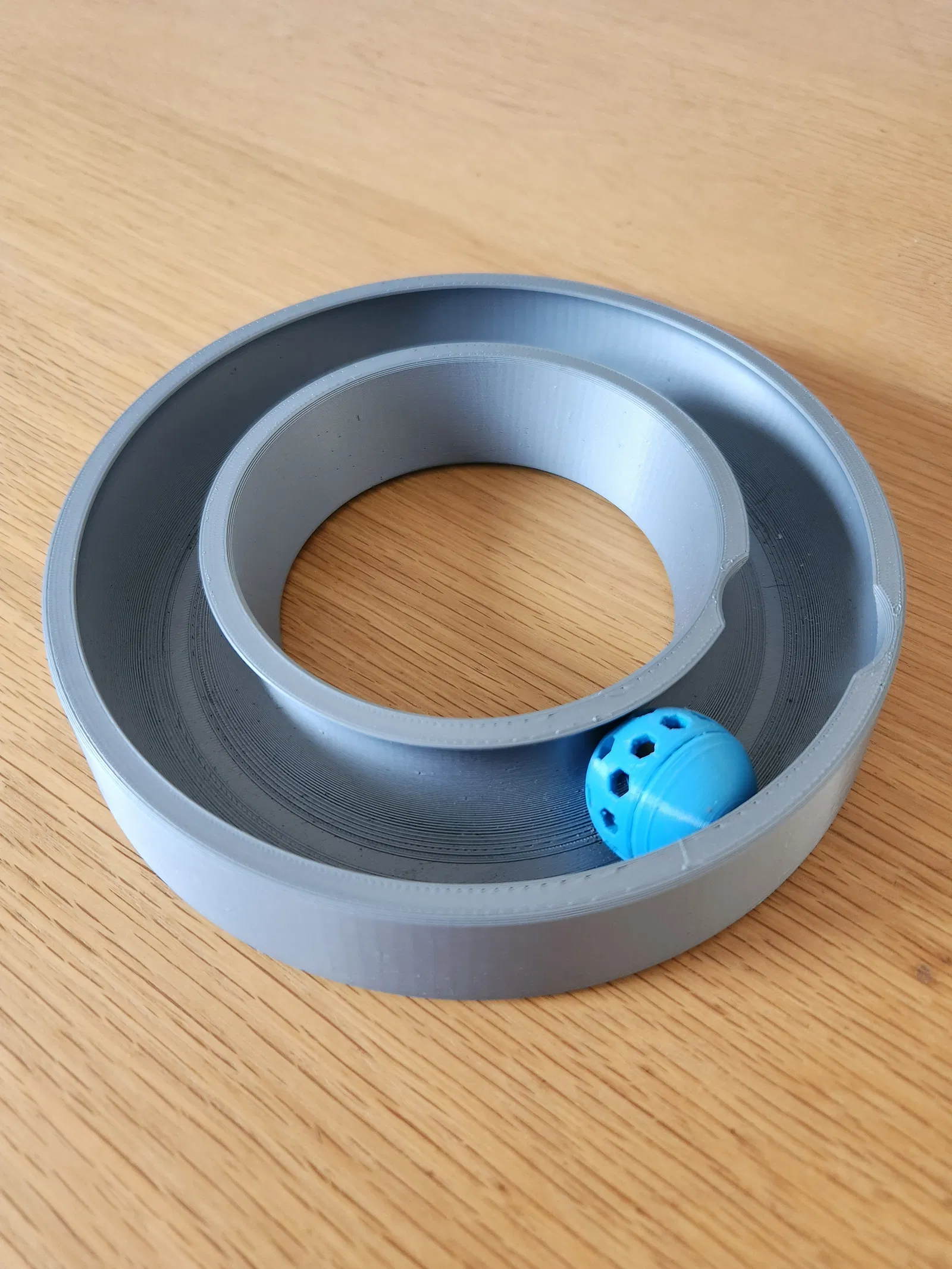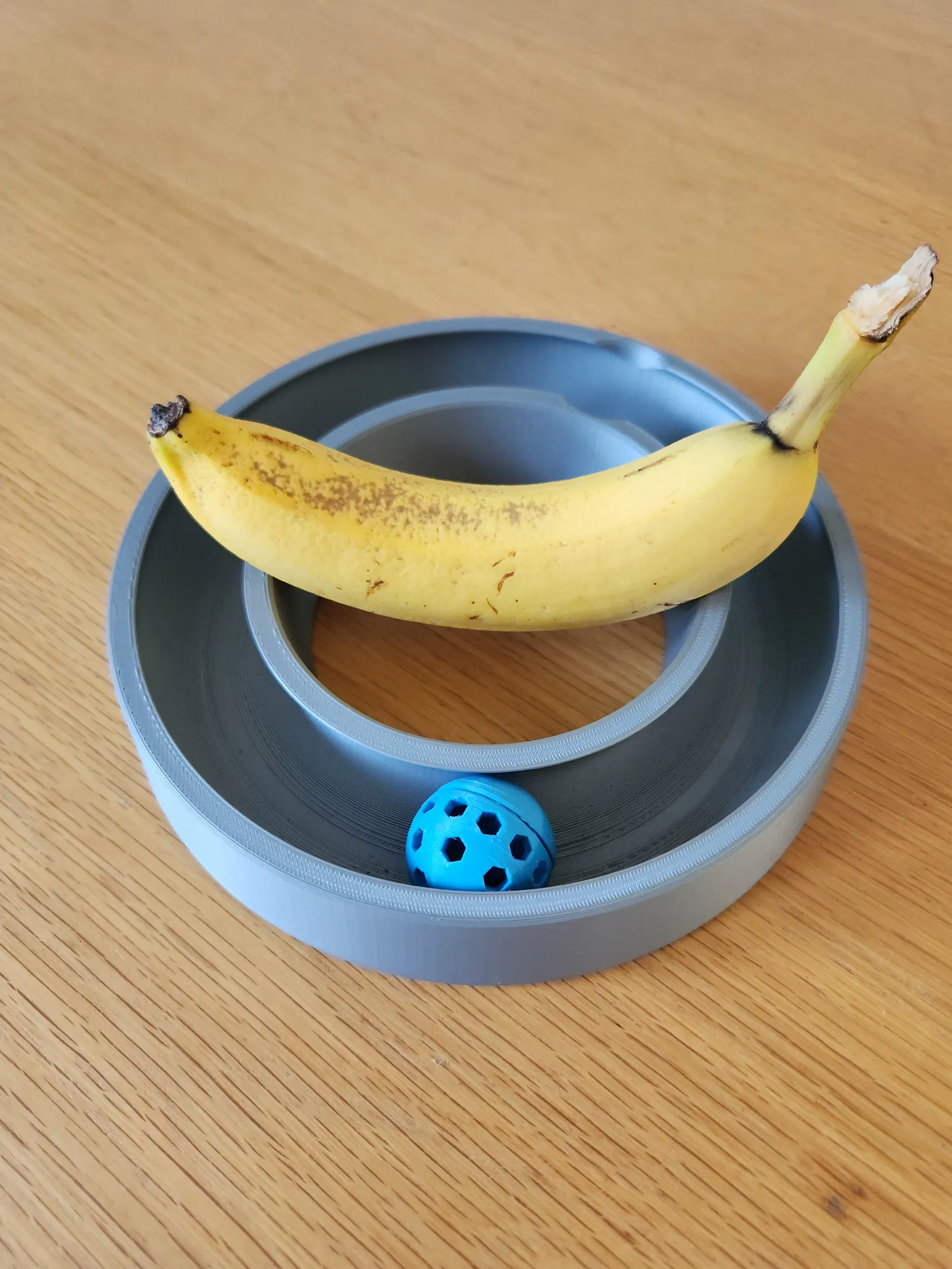 Đồ chơi cho mèo dạng trái banh giữ chân. Có thể bỏ đồ ăn vặt vào trong trái banh để thu hút sự chú ý của mèo cưng. Tham khảo phiên bản mới hơn, có thể lắp ghép tại đây