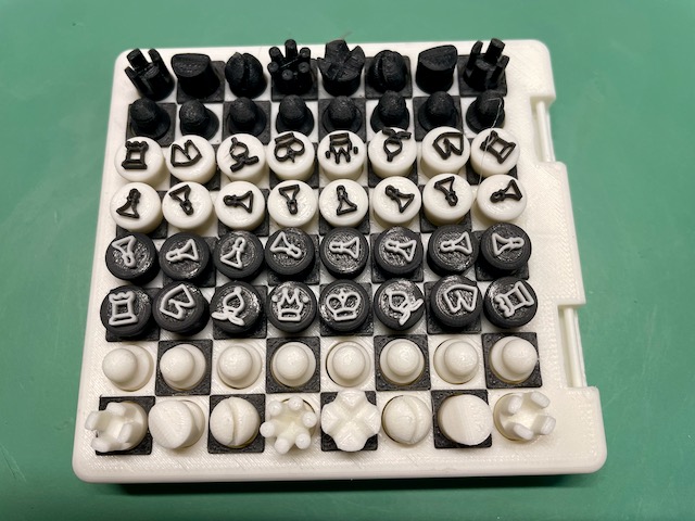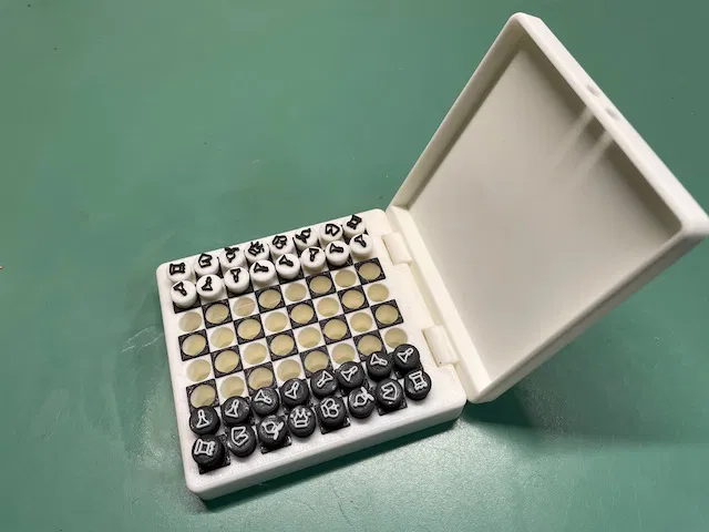 Phiên bản cờ vua di động Travel-Chess, dễ dàng mang theo. Có 2 bộ quân cờ, một với ký hiệu đơn giản và một với quân cờ tiêu chuẩn thu nhỏ. Nắp có thể dùng làm khay đựng quân cờ. In bằng PLA với lớp cao 0.2mm và 0.1mm cho quân cờ.