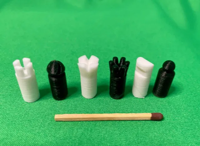 Có 2 bộ quân cờ. Một bộ có các ký hiệu đơn giản ở trên cùng, và một bộ bắt nguồn từ các quân cờ tiêu chuẩn, nhưng sao cho chúng có thể in được ở kích thước nhỏ này với vòi phun 0,4 mm và lớp cao 0,1 mm. Vì vậy, hãy chọn bộ bạn thích.