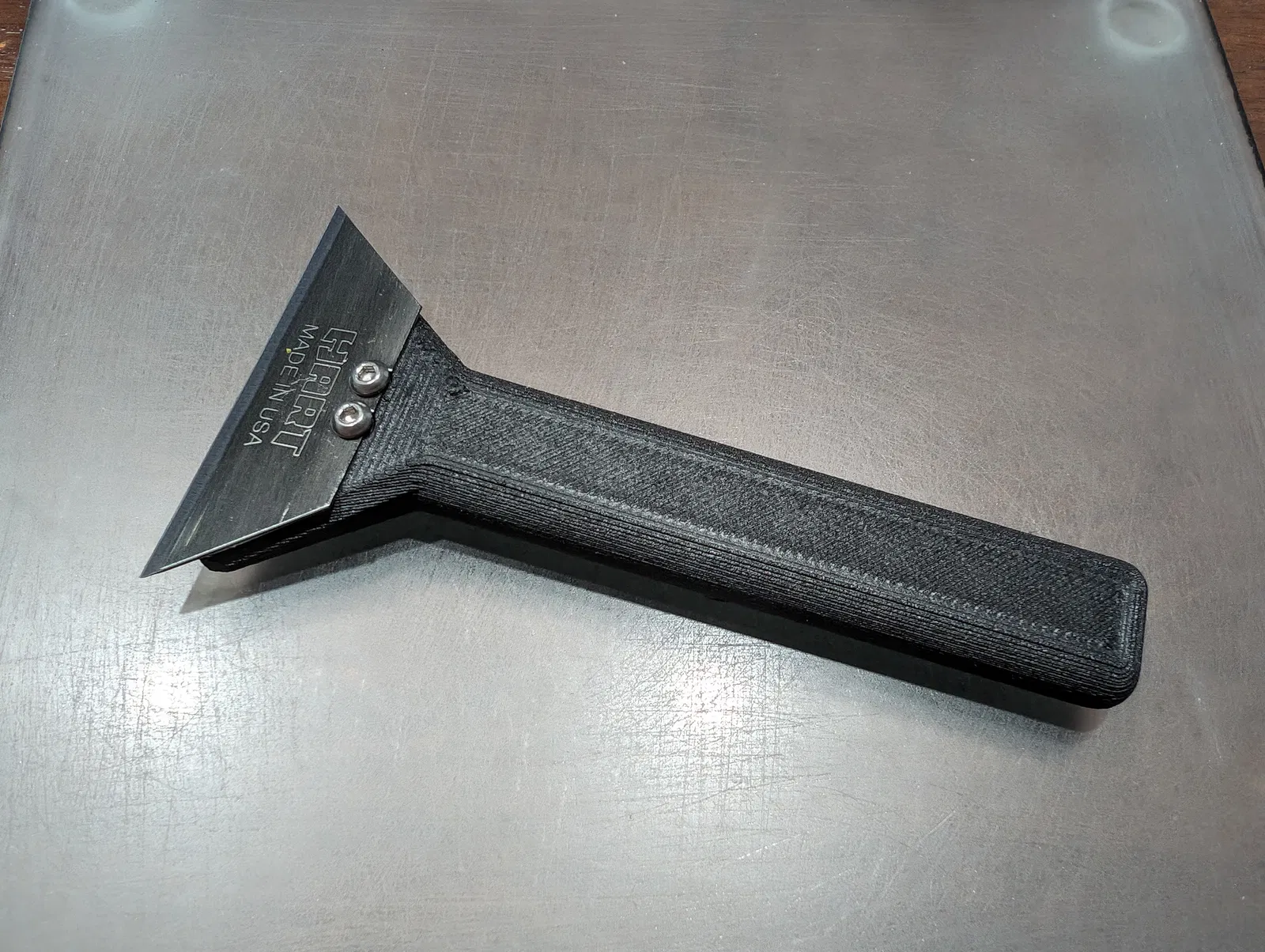 Tay cầm dao cạo dùng lưỡi dao rọc giấy thông thường. Phiên bản làm lại sử dụng đai ốc lục giác M3 thay vì chèn ép nhiệt. Dùng ốc M3 dài 8mm với đai ốc lục giác.