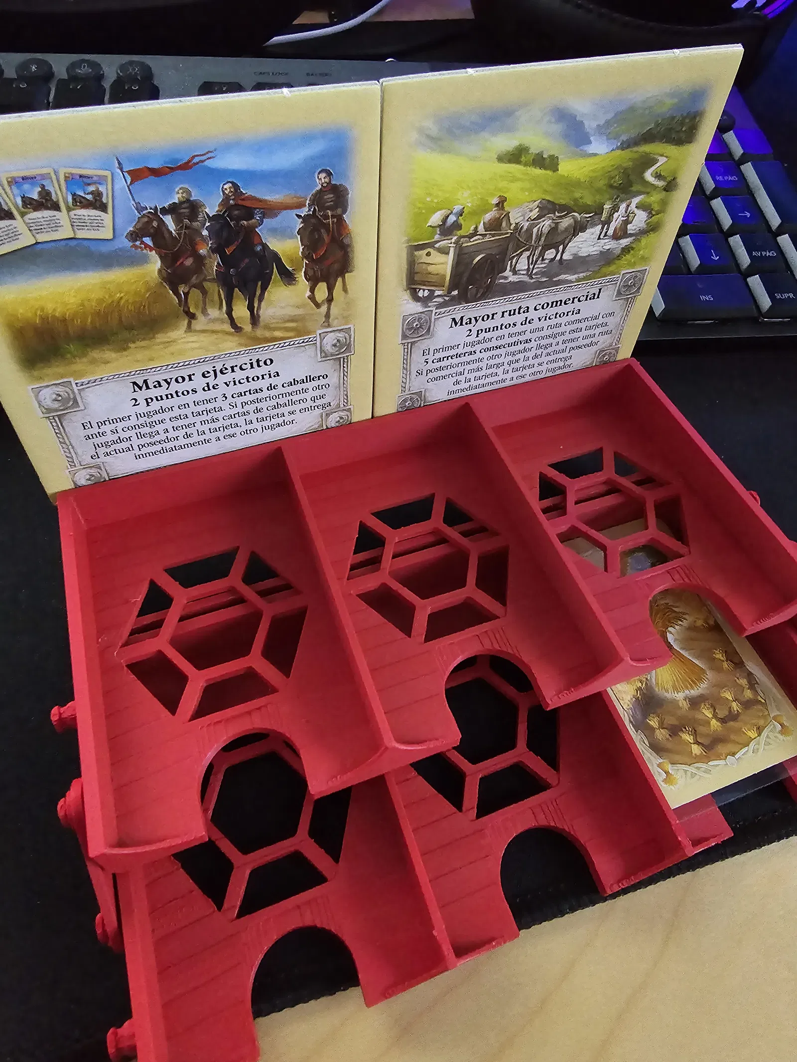 Mô hình làm lại này bổ sung thêm không gian cho bộ bảo vệ bài, đồng thời thêm khe giữ thẻ điểm chiến thắng. Rất phù hợp cho anh em mê Catan muốn sắp xếp bài gọn gàng hơn.