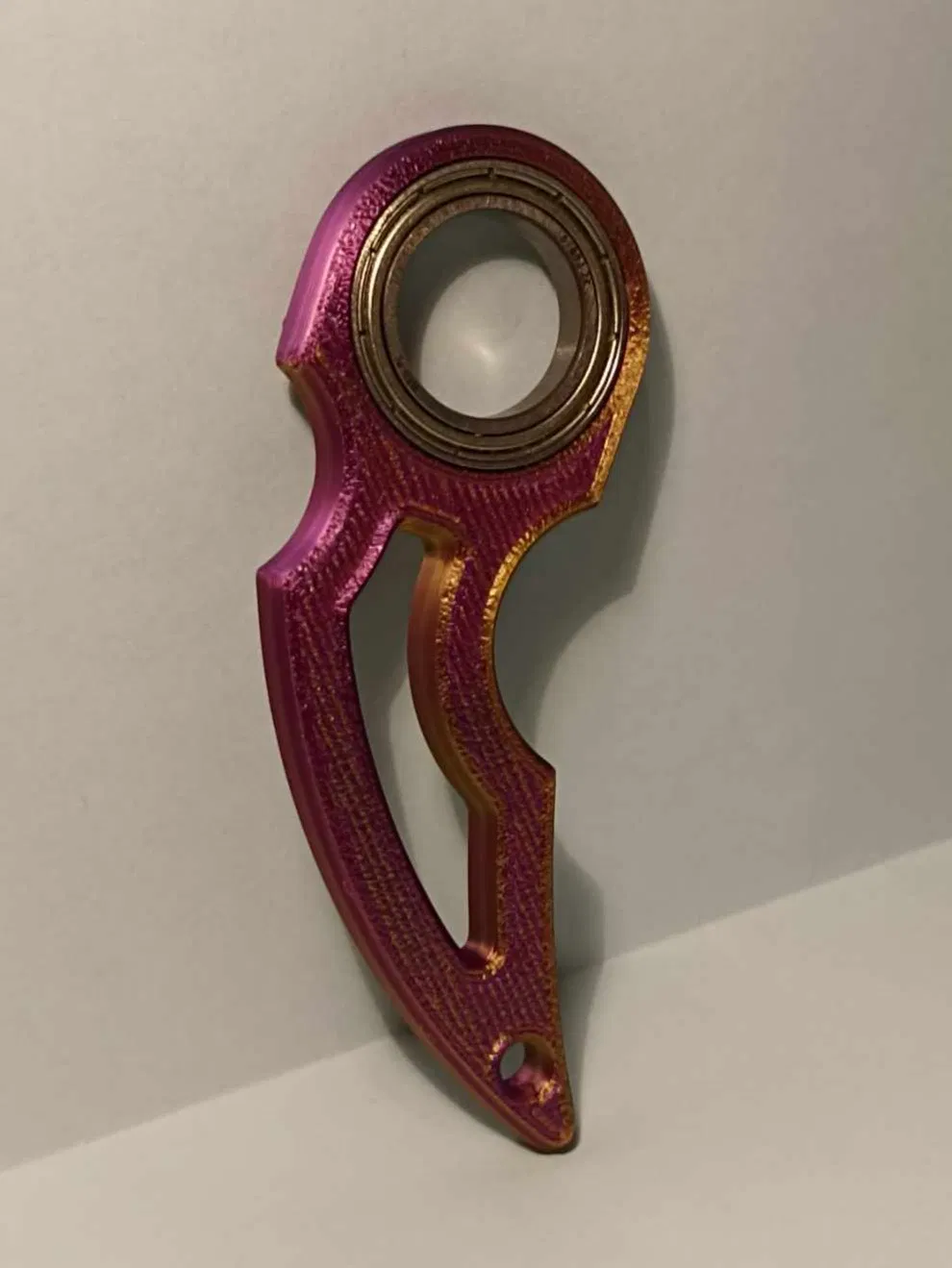 Móc khóa Keyrambit độc đáo, là bản remix cho bạc đạn 6803, giúp trang sức chìa khóa của bạn thêm phần cá tính. In bằng PLA Silk Dual Color tím vàng cực đẹp mắt.