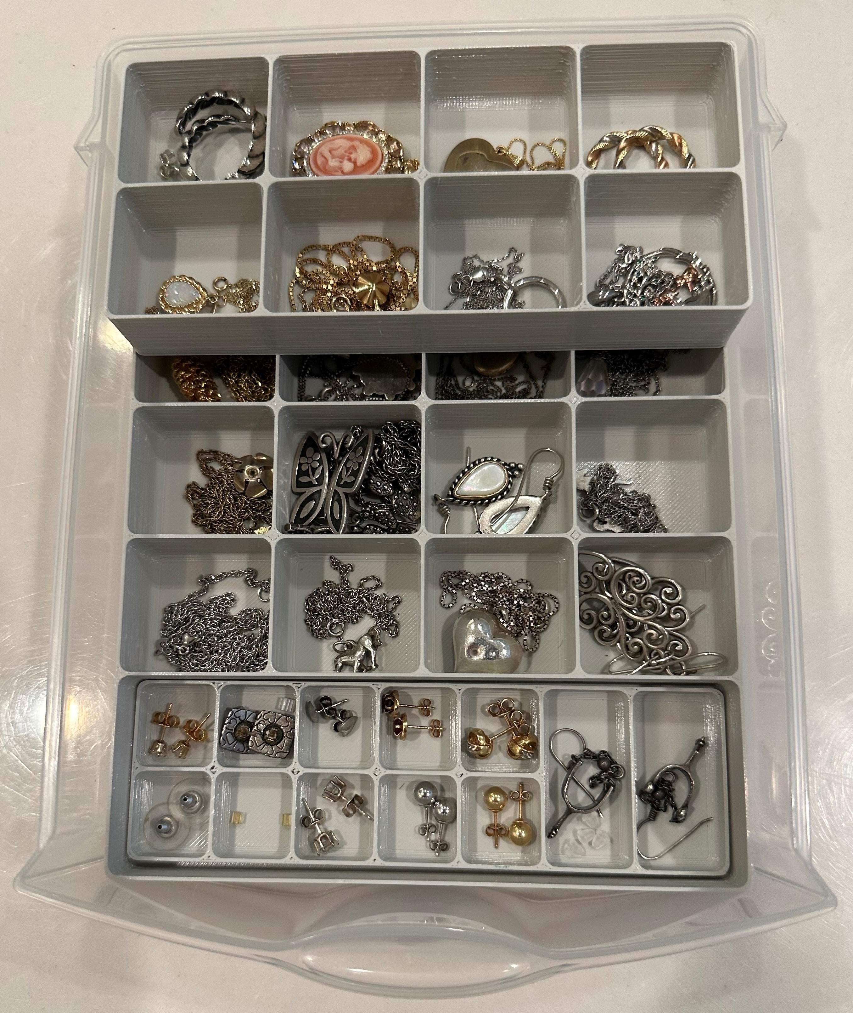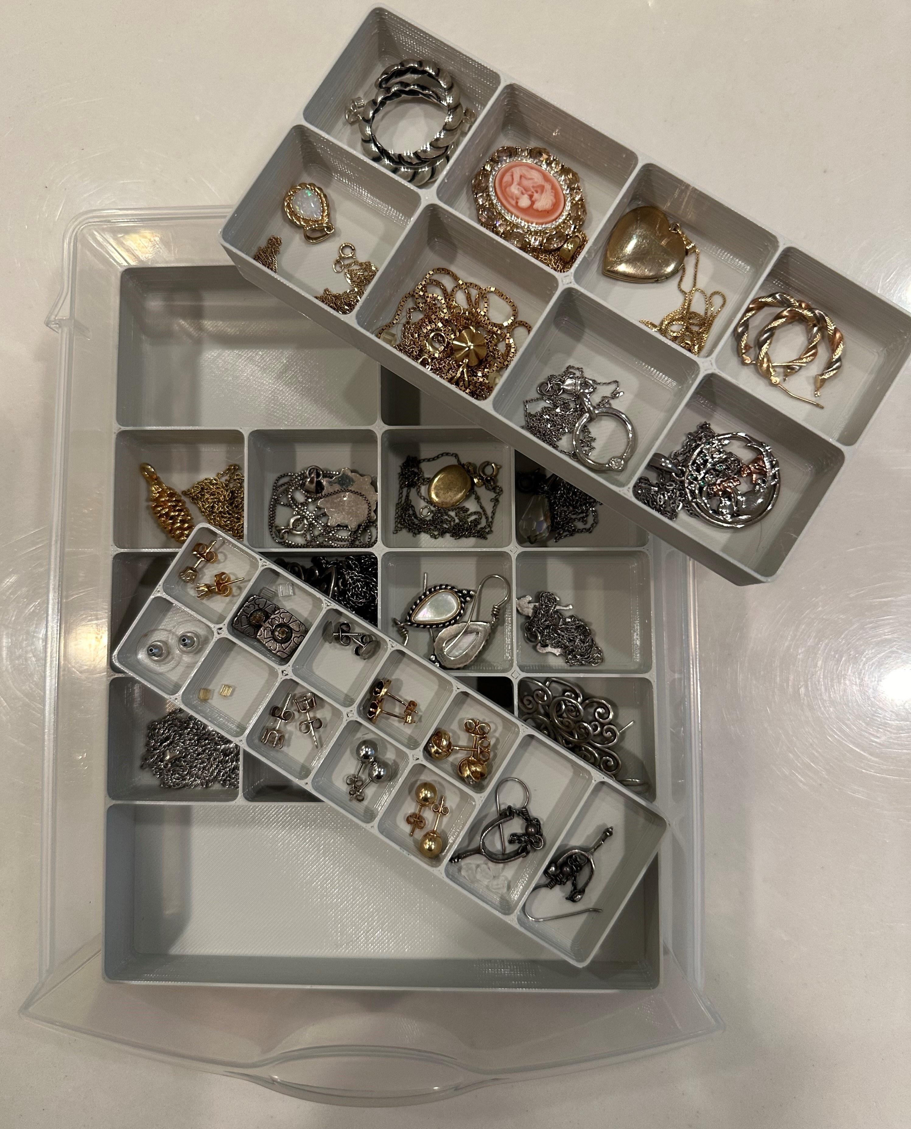 Mấy cái khay nhỏ để đựng trang sức, đồ thủ công hay đồ linh tinh, bỏ vừa tủ 5 ngăn Sterlite. Khay xếp chồng, hàng trên trượt để lấy đồ dưới. Thiết kế linh hoạt tùy chỉnh.