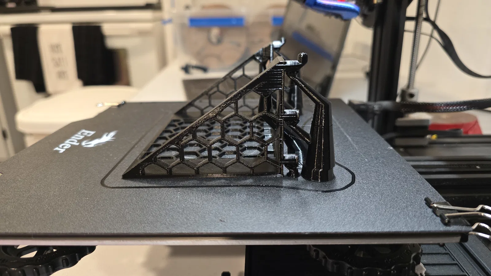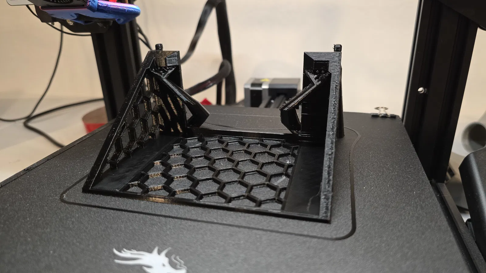 Cái lỗ treo đồ được canh cách nhau 5 inch nha. Có thể in bằng support cho những bề mặt phẳng thôi, tui đã dùng tree supports và chỉnh góc nghiêng support là 65 độ.