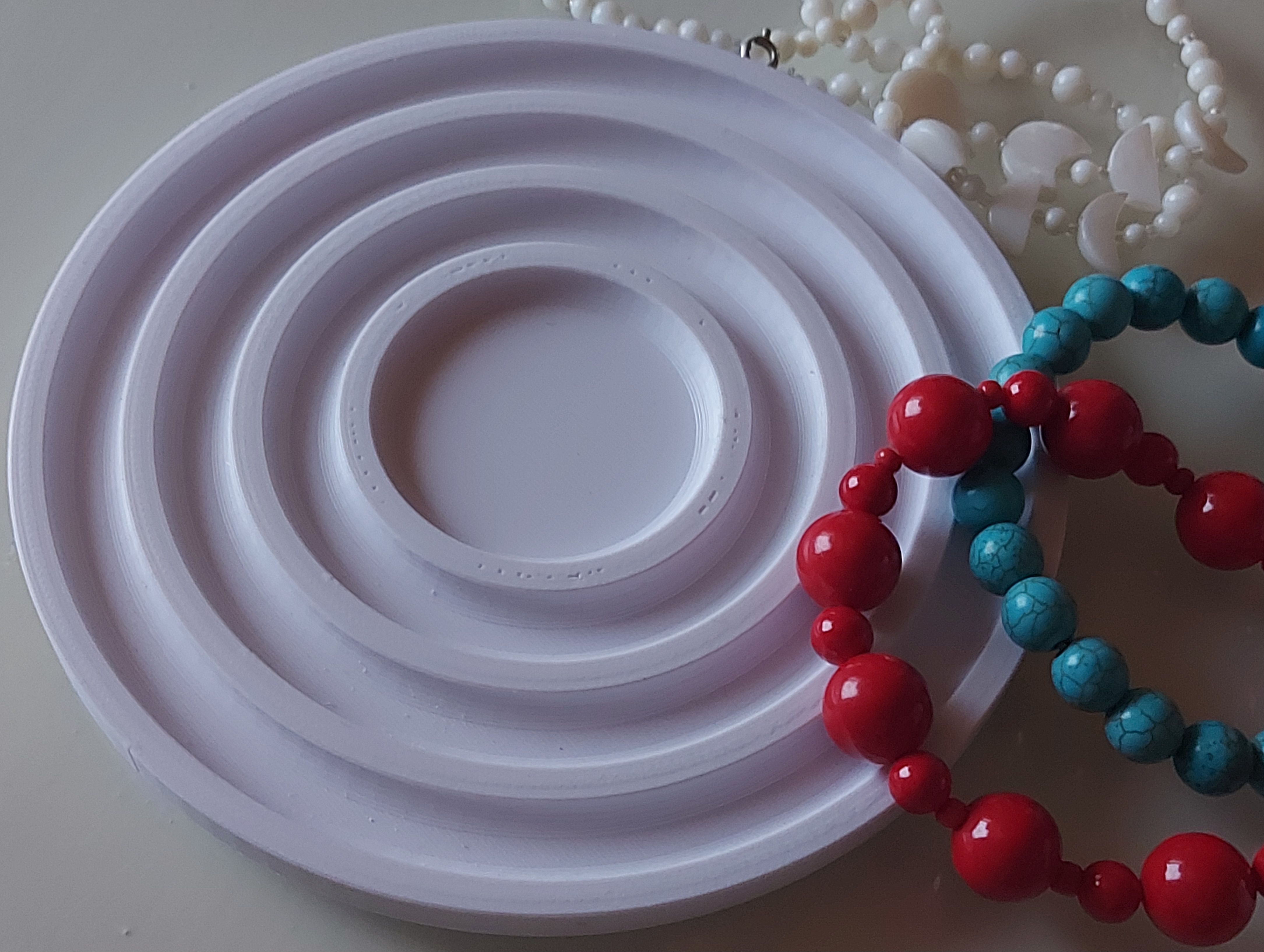 Khay đựng và sắp xếp hạt cườm của bạn. Rãnh ngoài cùng vừa cho vòng cổ choker, rãnh nhỏ nhất cho vòng tay. Phần giữa tiện lợi cho các bộ phận linh tinh. In bằng PLA, 3 perimeters, 20% infill để chắc chắn.